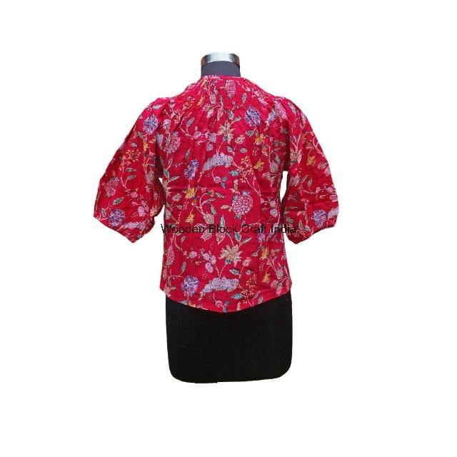 Camisa de Verano Vintage con Estampado Digital Indio para Mujer, Algodón Puro, Diseño Floral Bohemio, Mangas Abullonadas, Decoración con Borlas
