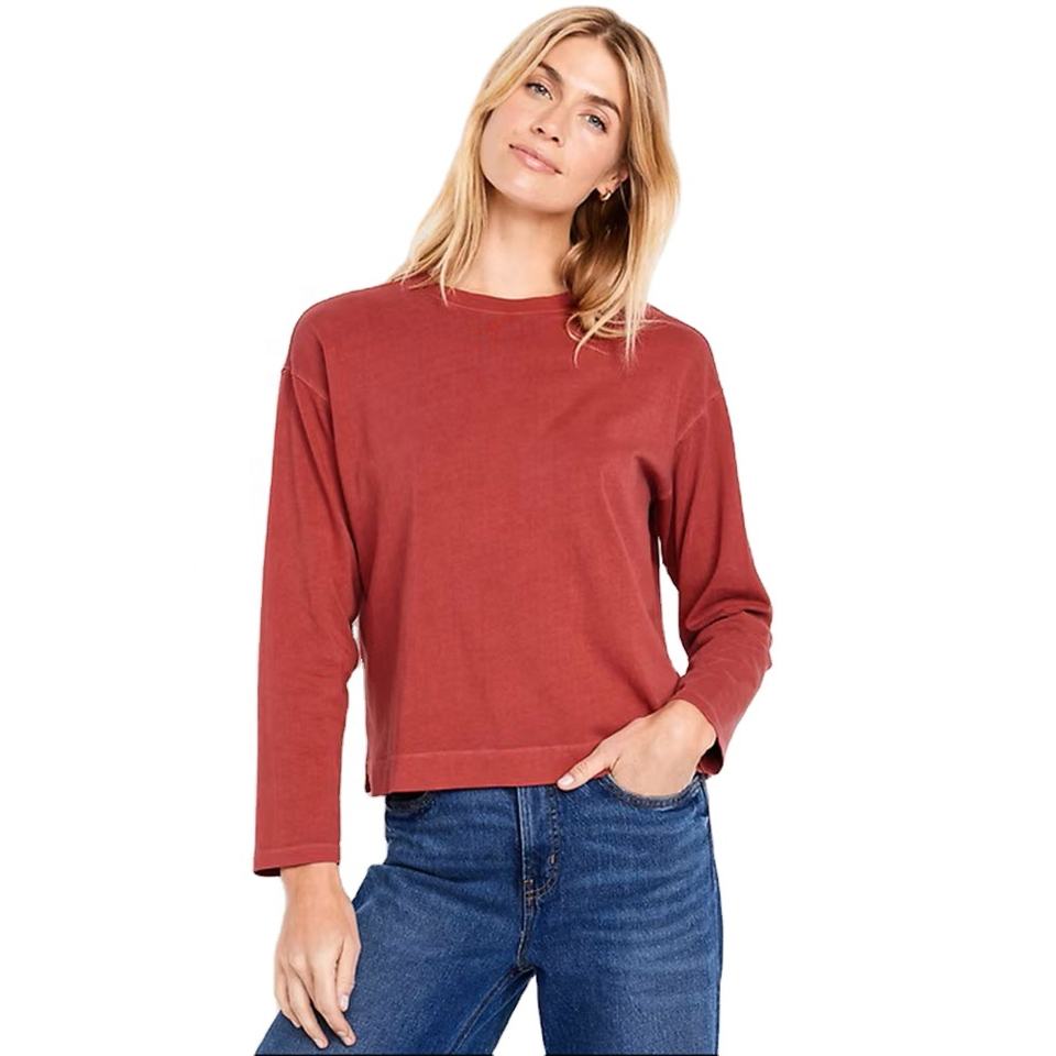 Camiseta de manga larga con cuello redondo para mujer de estilo sin esfuerzo, camiseta de tela suave de Color sólido vibrante, perfecta para compradores al por mayor