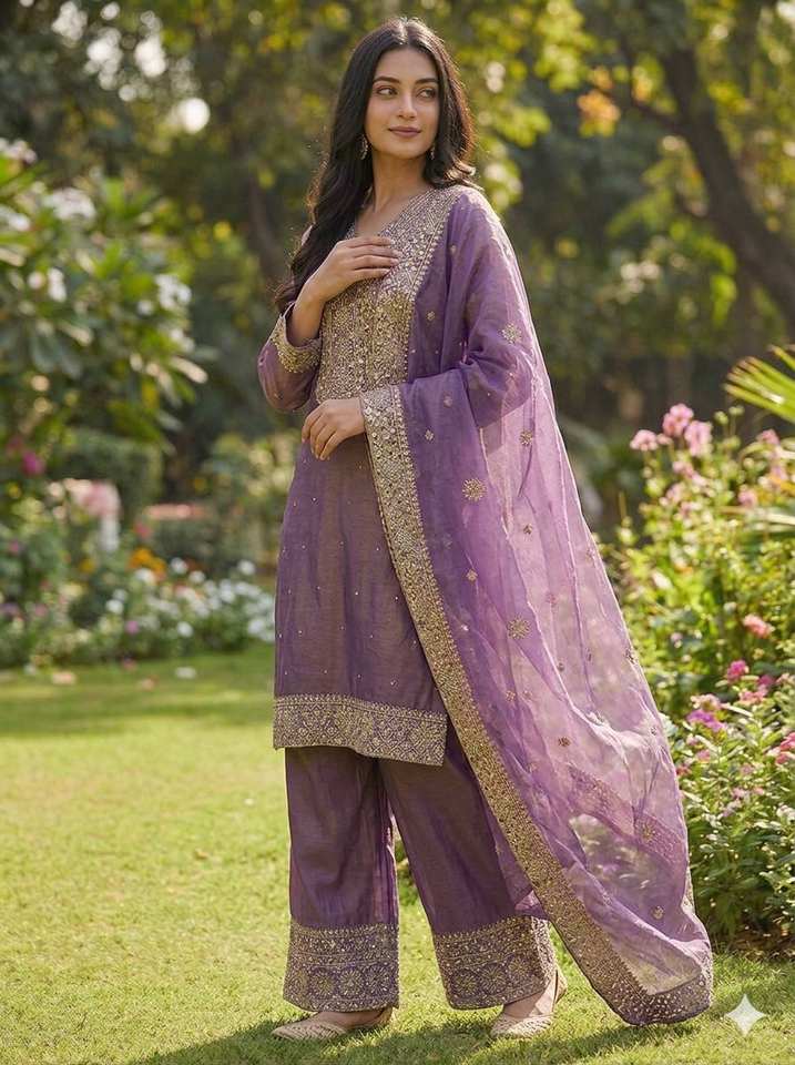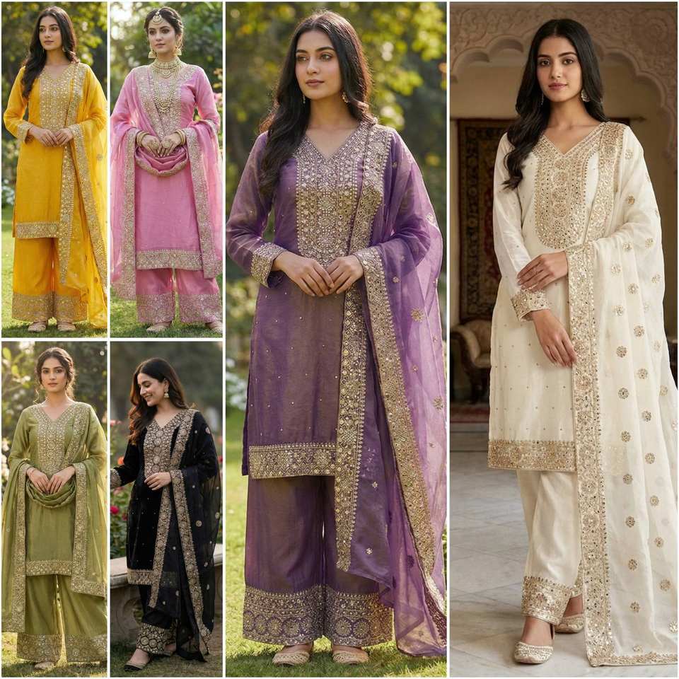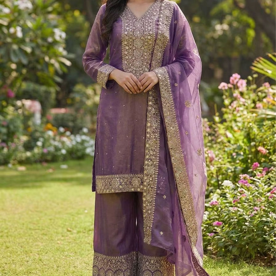 Colección Eid en seda Fendy con conjunto de top, pantalón y dupatta con bordados elaborados.