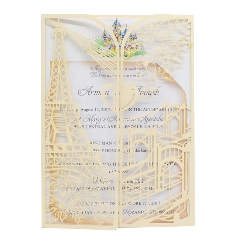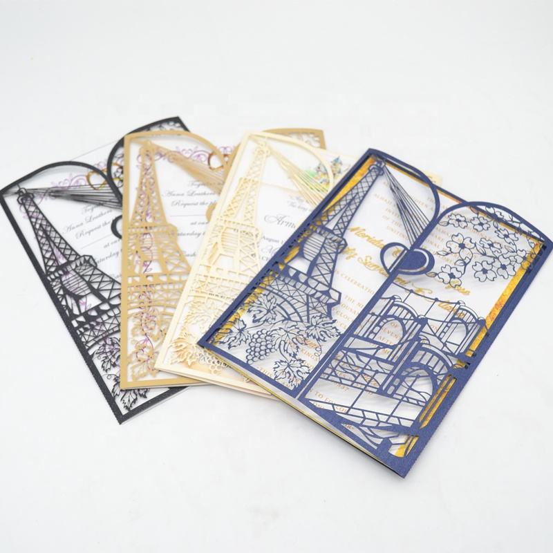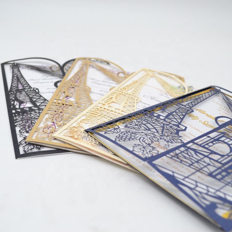 Invitación de Boda de Lujo con Diseño de la Torre Eiffel, Estilo Europeo, Plegable, con Corte Láser