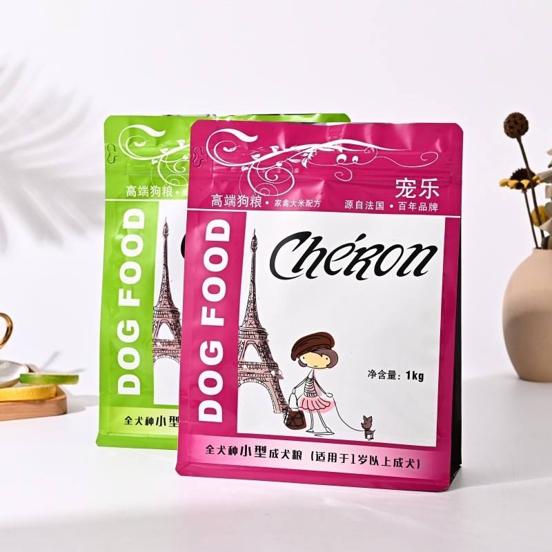 Ocho bolsas de plástico personalizadas con fondo plano y sellado lateral, para envasar proteína en polvo, granos de café, frutas, cereales, con cierre hermético.