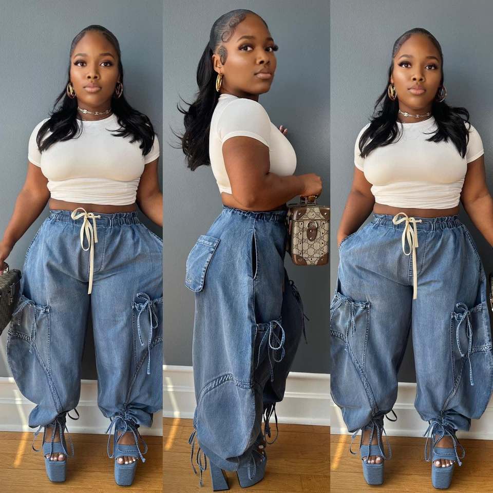Pantalones vaqueros informales holgados con cordón elástico en la cintura y lazo para mujer, a la moda