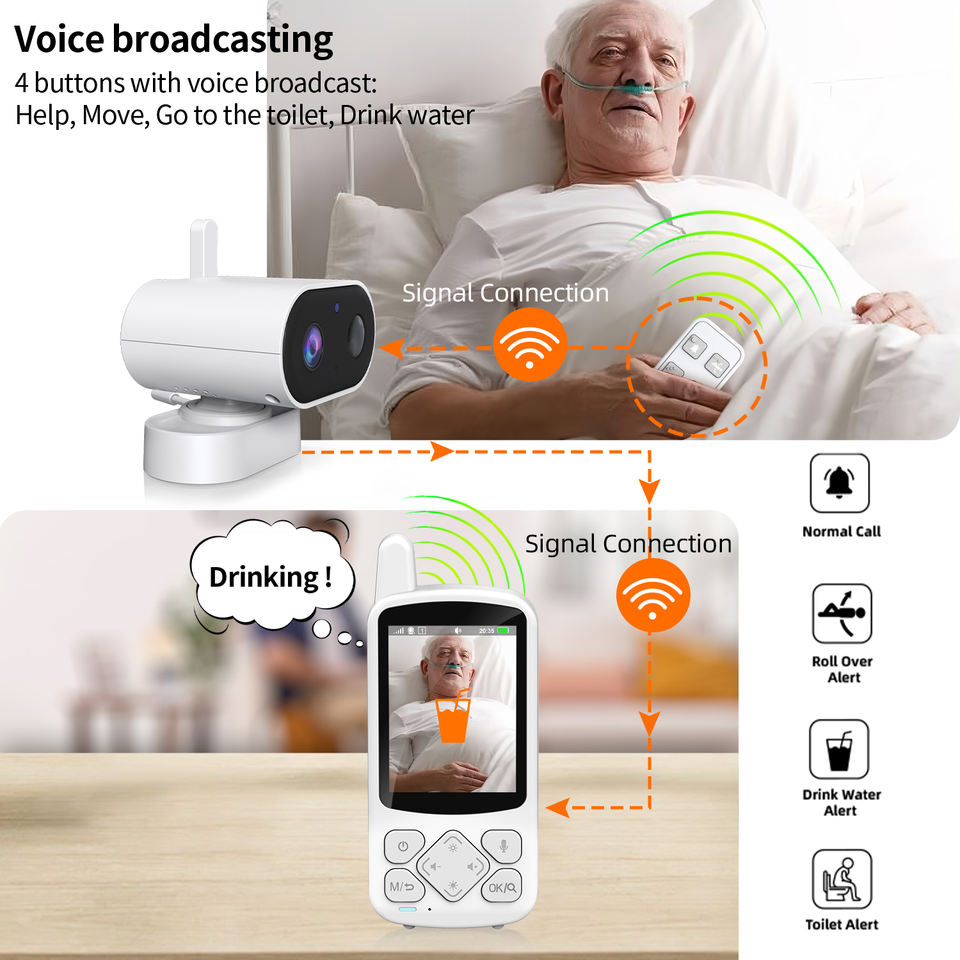 Monitor de Video para Personas Mayores con Control Remoto, Pantalla LCD de 2.8 Pulgadas, 720P, Visión Nocturna, Audio Bidireccional, Detección de Sonido, Sirena Integrada para Cuidadores