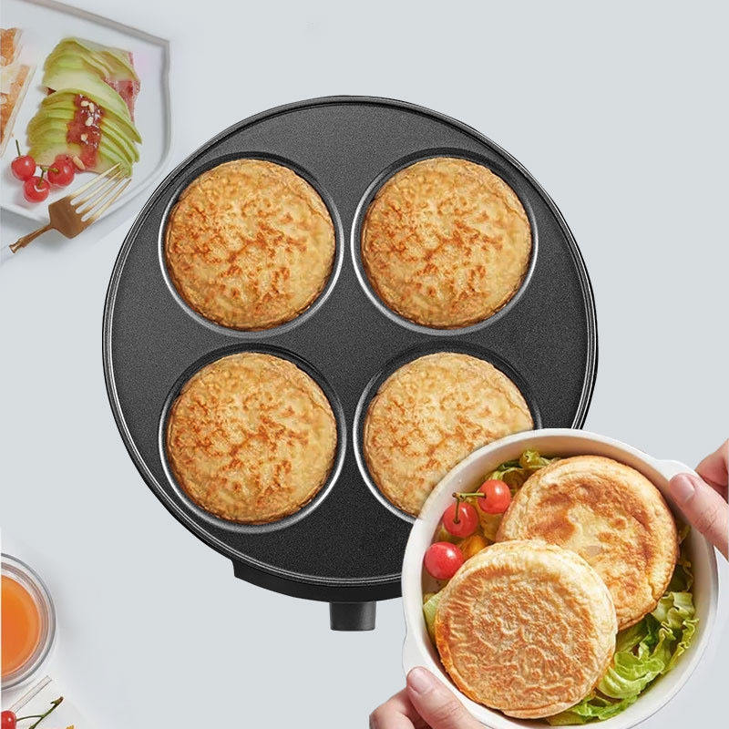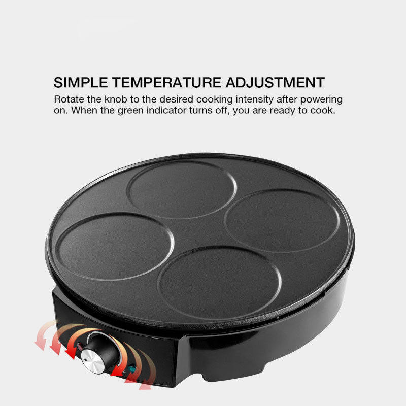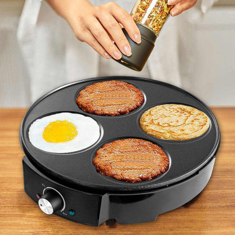 Plancha eléctrica multifuncional antiadherente de 35x9x38cm con cuatro zonas para cocinar panqueques, crepes, huevos y asar.