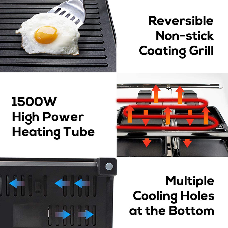 Característica:Antiadherente, BBQ de la familia, Control de temperatura ajustable con pantalla digital, Superficie de cocción antiadherente plana abierta de 180 grados, Limpieza fácil