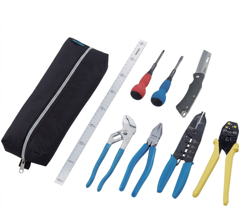 Pelacables, Herramienta de crimpado, Cuchillo, Cinta métrica, Alicates, Destornillador