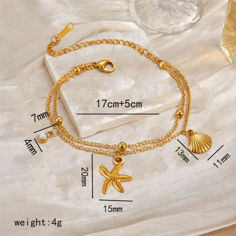 Elegante Brazalete Chapado en Oro Real de 18K Hecho de Acero Inoxidable 304 con Incrustaciones de Circonita en Forma de Estrella de Mar y Concha de Doble Capa