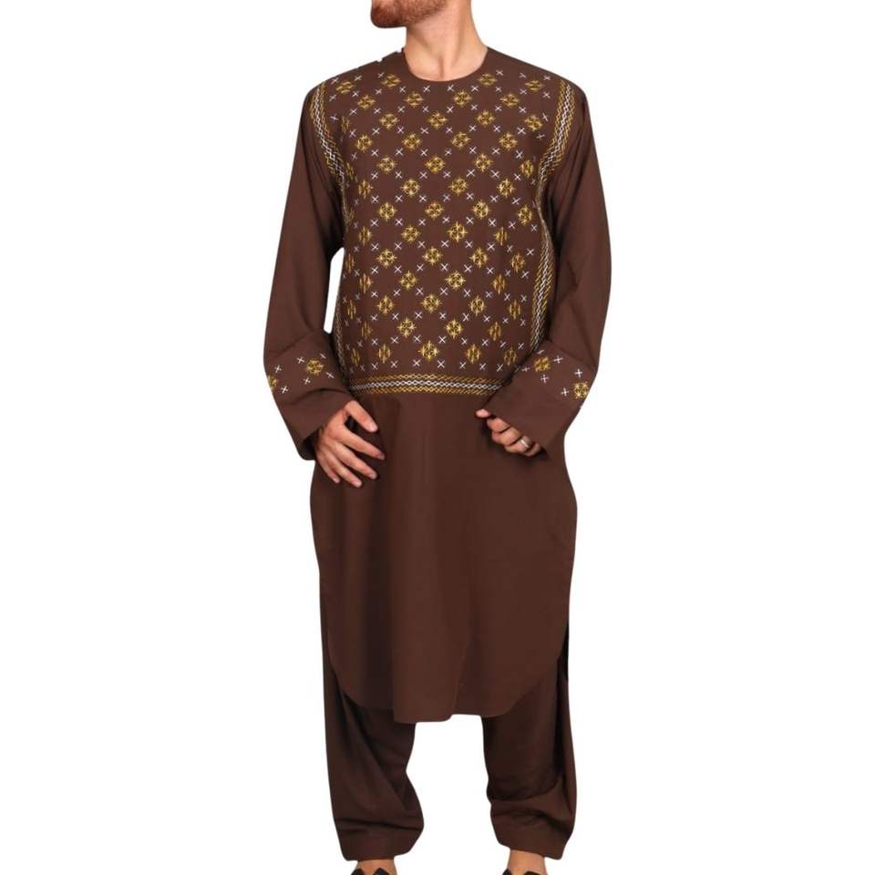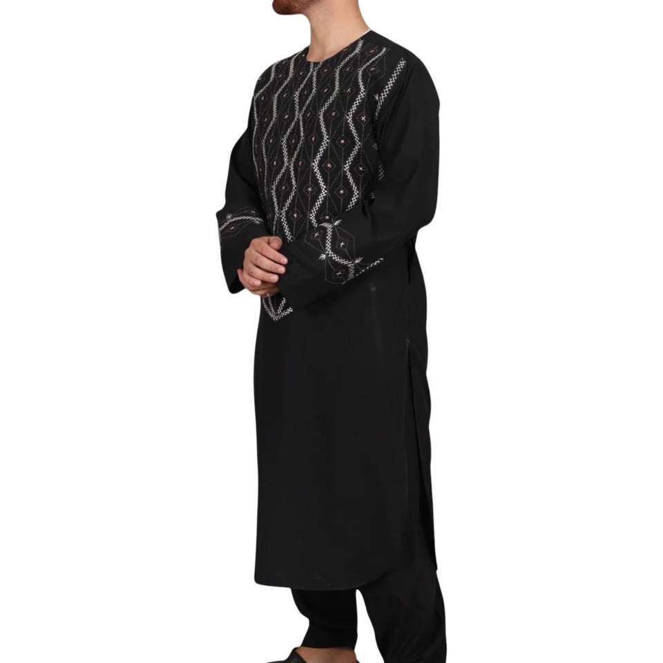 Elegante Traje Afgano Negro para Hombre con Bordado en Zigzag, Conjunto Tradicional Islámico Shalwar Kameez para Ocasiones Religiosas