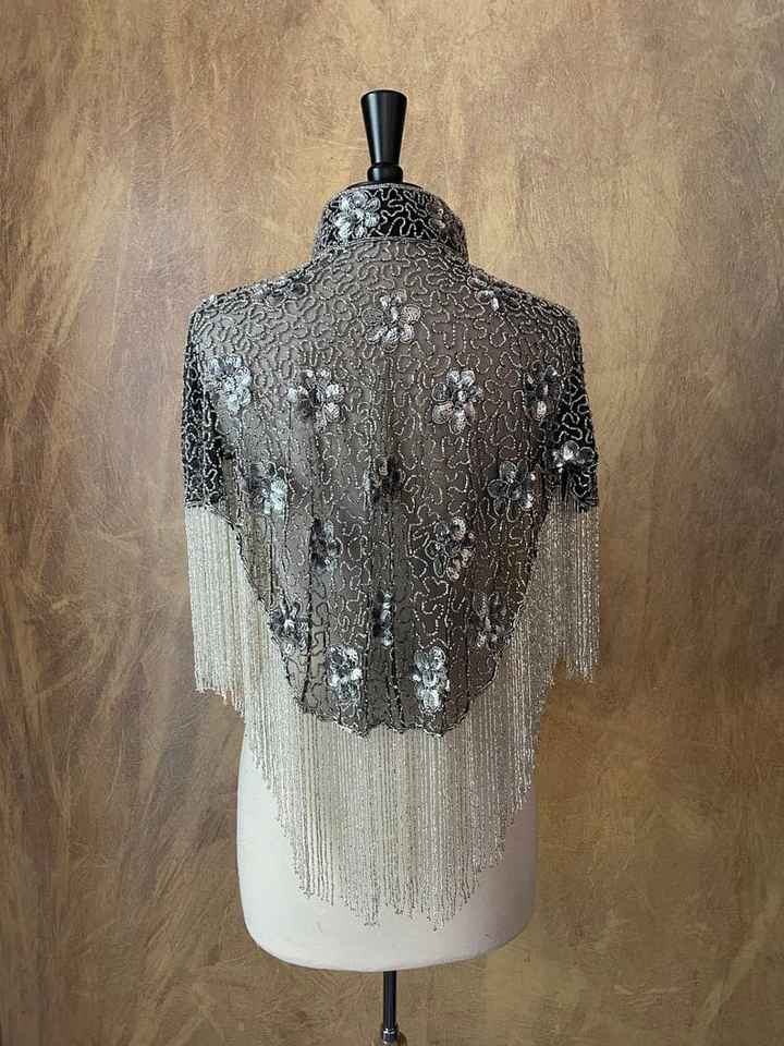Elegante capa burlesca con cuentas hebras lentejuelas silueta recta sujeta cuello envoltura festiva Club ocasiones adulto poliéster