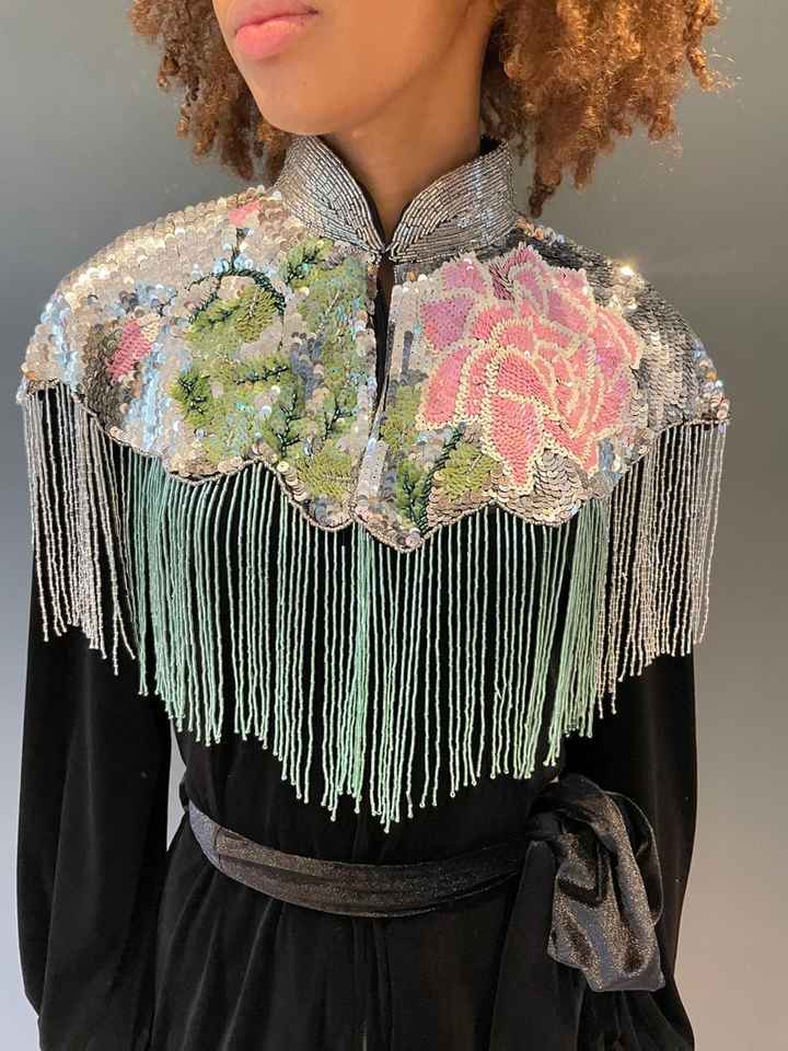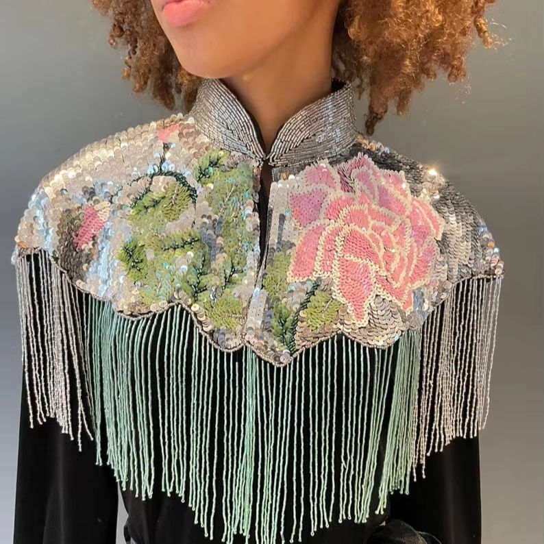 Elegante capa burlesca con hebras de cuentas lentejuelas hermosa silueta recta sujeta el cuello envoltura festiva para ocasiones de Club