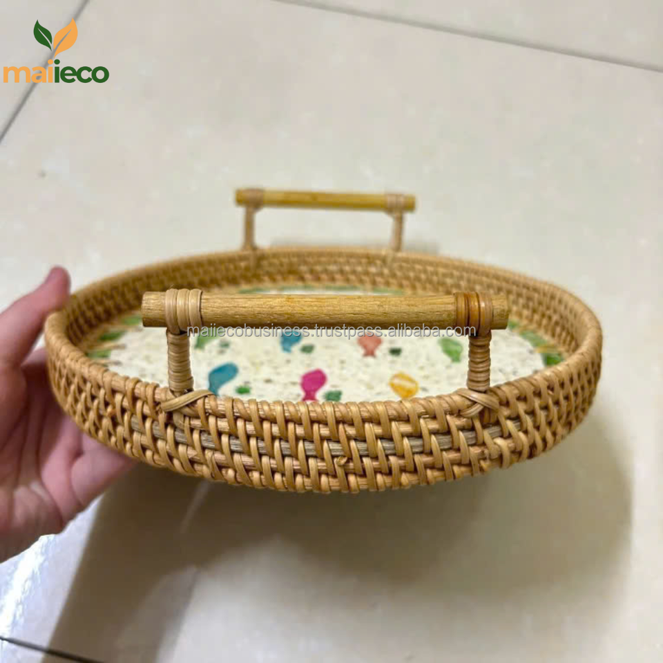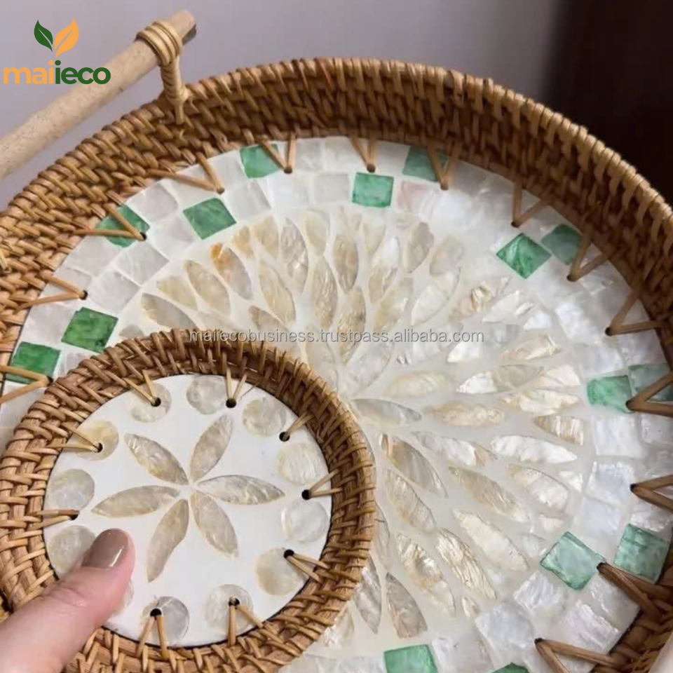 Product name:Mother Of Pearl Round Rattan Tray With Handles