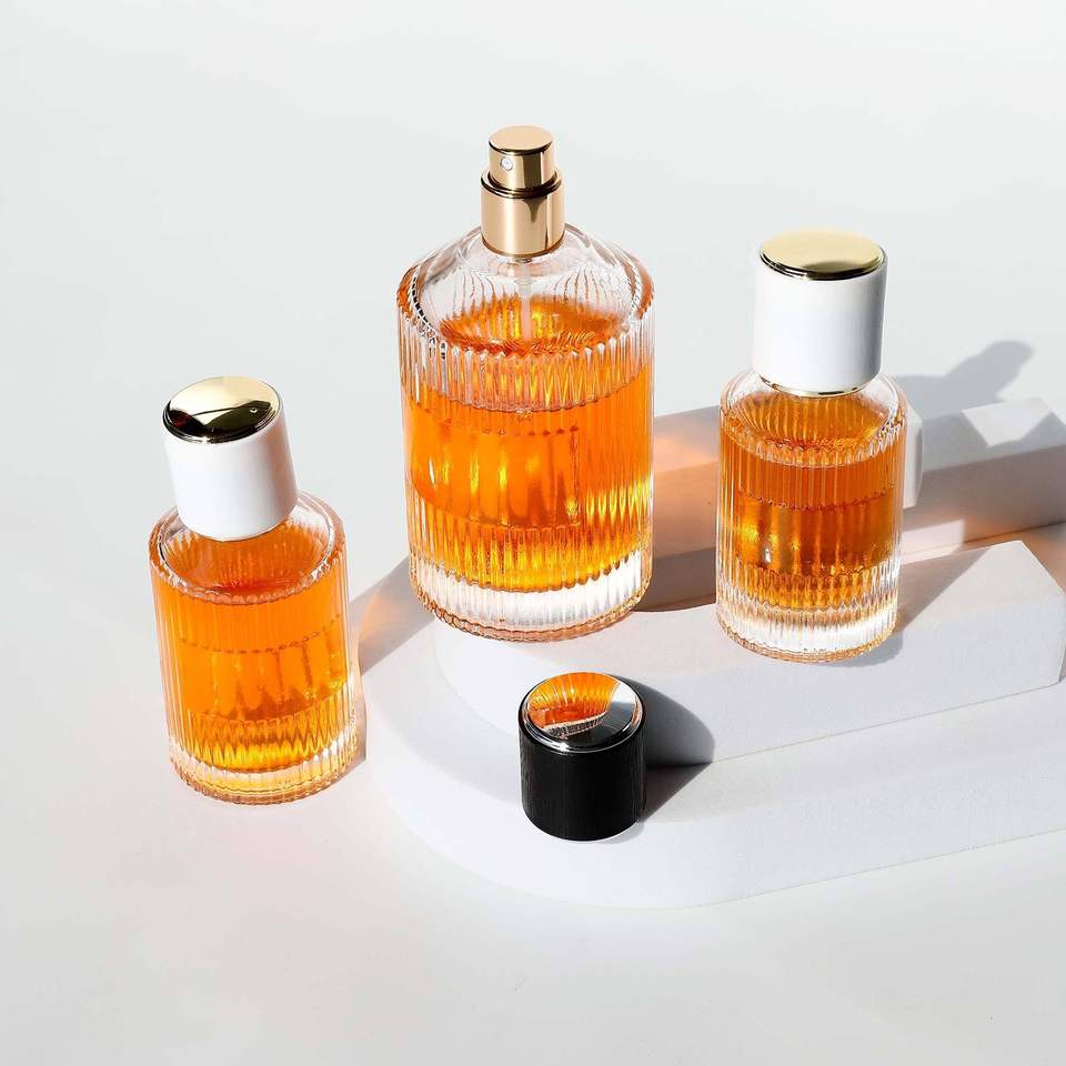 Elegantes Frascos de Perfume de Vidrio de 100 ml con Diseño de Rayas Transparentes Personalizables, Tapa de Plástico/Madera, Serigrafía/Estampado en Caliente para Cosméticos