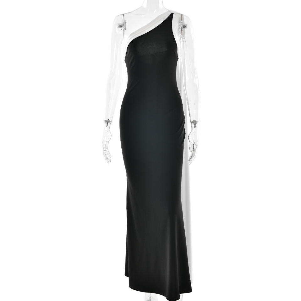 Elegante Vestido Maxi de Un Solo Hombro con Bloques de Color, Espalda Descubierta, Cintura Ajustada y Diseño en Contraste para Noche