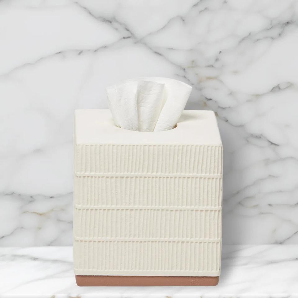 Elegante Caja de Pañuelos de Cerámica con Diseño Acanalado Color Crema y Base de Terracota, Portapañuelos Cuadrado Blanco Texturizado Moderno