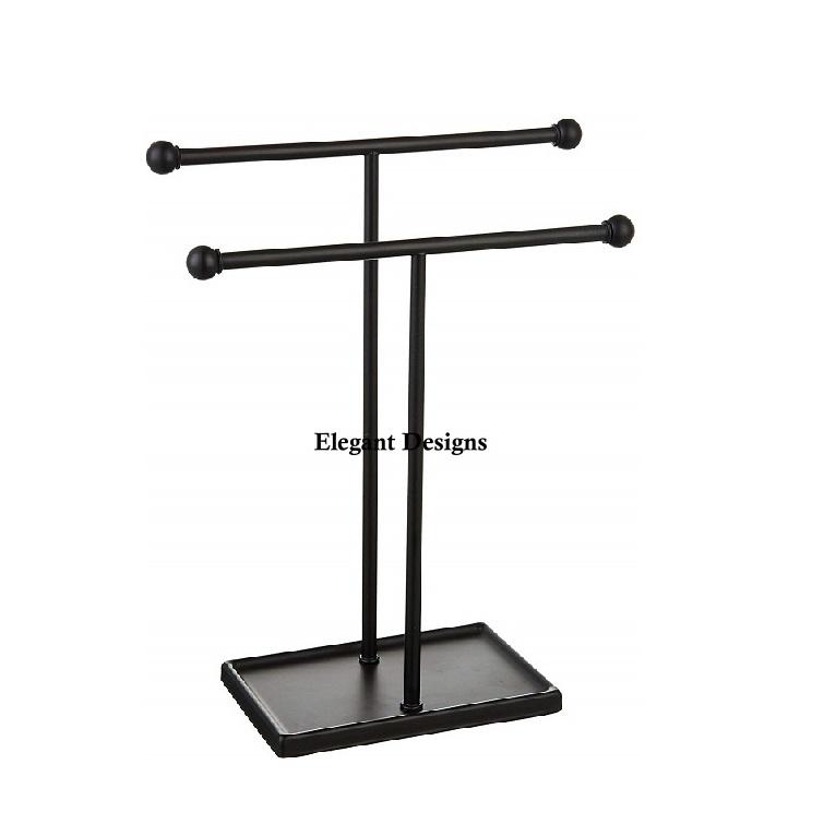 Elegante soporte de joyería de dos niveles de metal doble de diseñador, soporte hecho a mano con recubrimiento en polvo negro, soporte de joyería de lujo más vendido