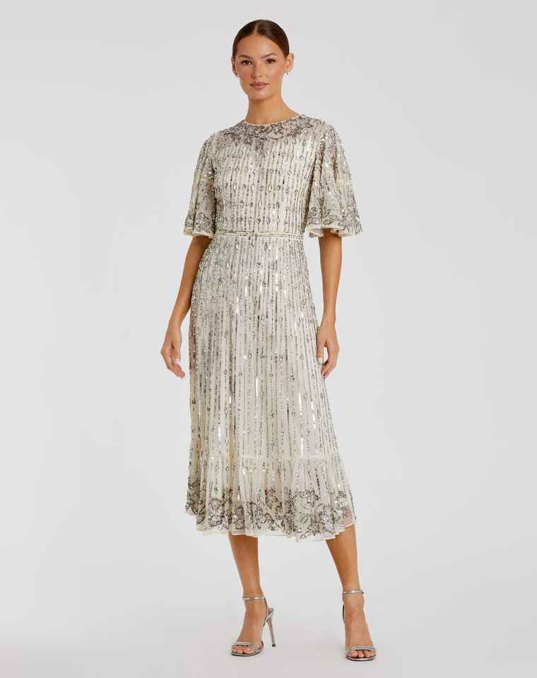 Elegante Vestido de Noche Largo hasta la Rodilla, Estilo Aline, de Chifón Sólido, con Mangas de Lentejuelas y Cuentas, Estilo Vestido de Gala para Fiesta