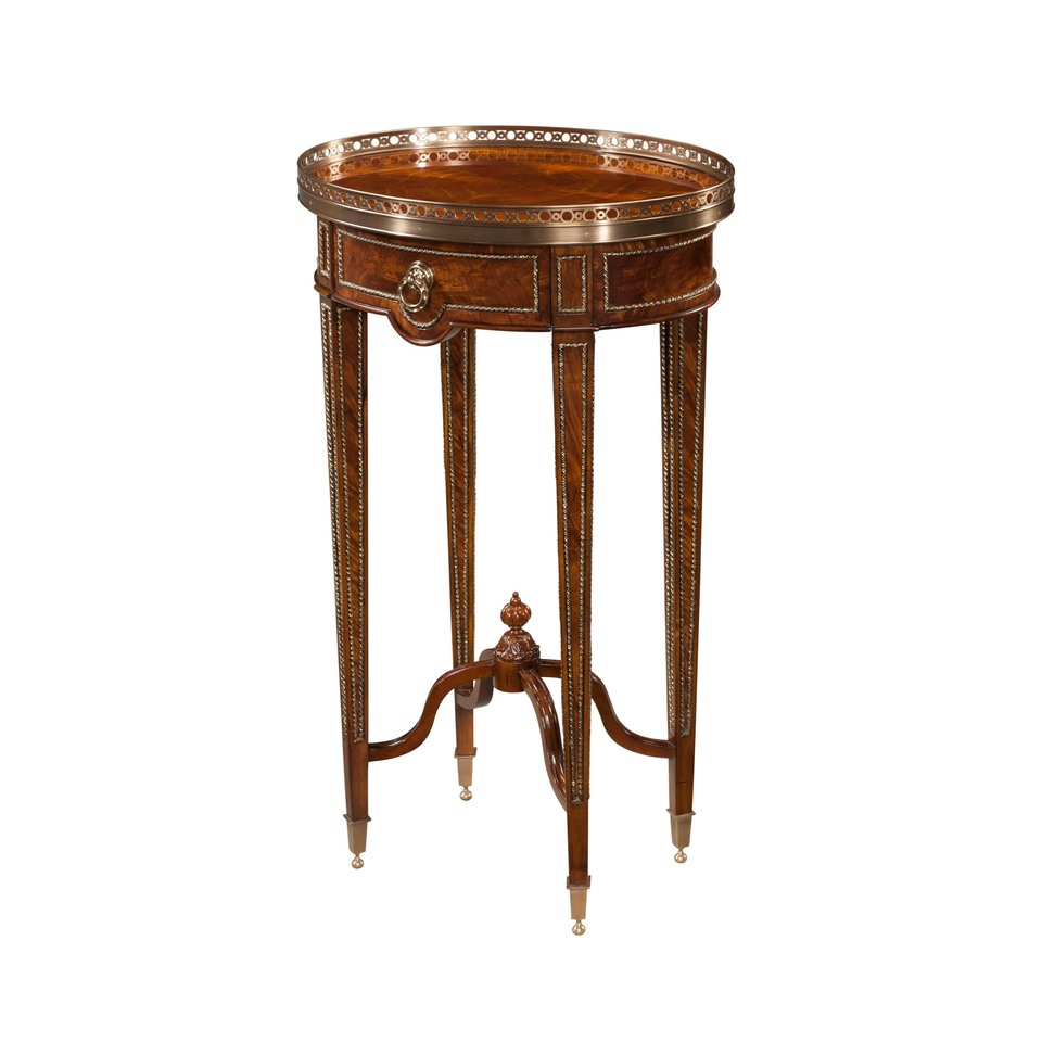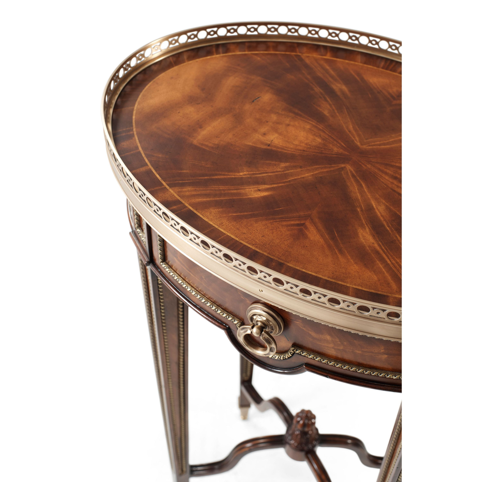Elegante Mesa Consola Redonda de Estilo Neoclásico Francés en Caoba Pulida con Riel de Galería y Detalles en Latón
