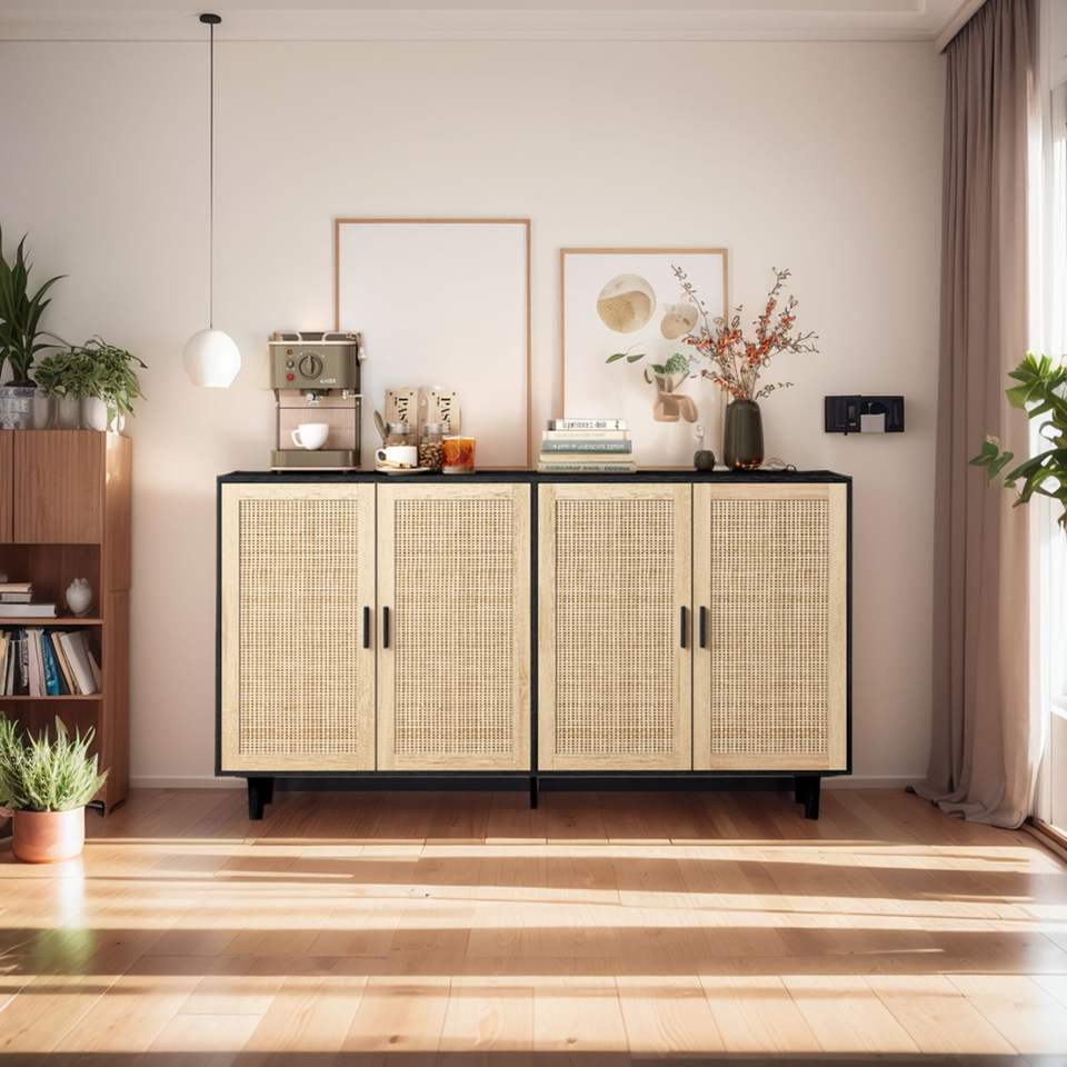 Elegante y Funcional Mueble de Almacenamiento Decorativo de Ratán de 4 Puertas, Color Negro, Fácil de Montar, para Dormitorio, Sala de Estar u Oficina, Misma Medida