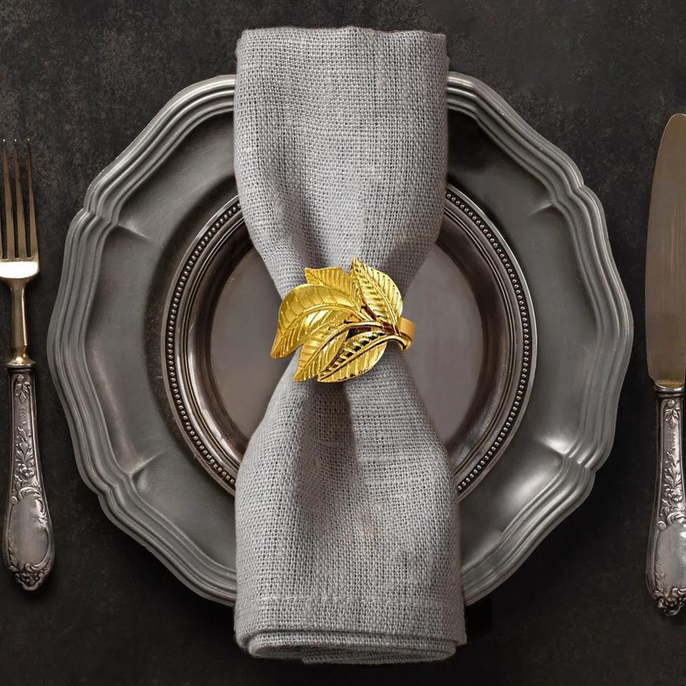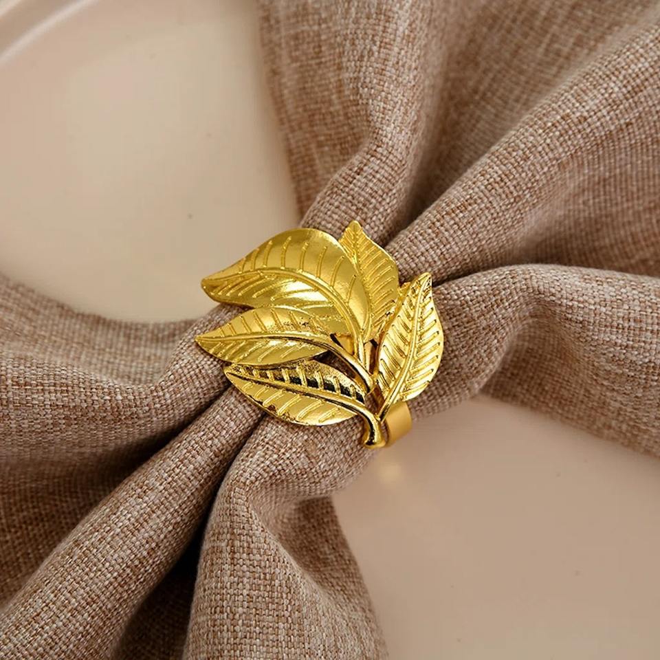 Elegantes Anillos para Servilletas con Hojas Doradas, Juego de 4 con Diseño Intrincado de Follaje en Capas, Lujoso Porta Servilletas Metálico Dorado con Triple Hoja