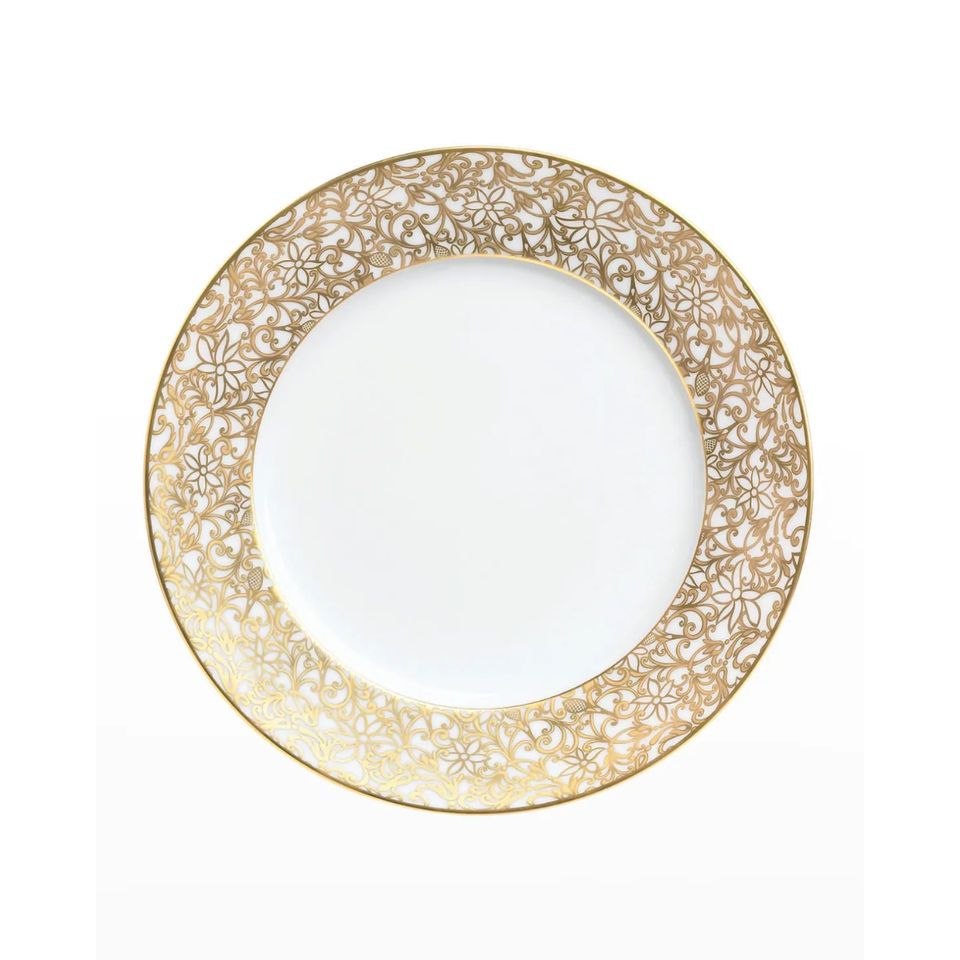 Placa de cargador de comida y postre redonda con diseño de malla metálica dorada elegante, perfecta para servicio de comida rápida de alta calidad
