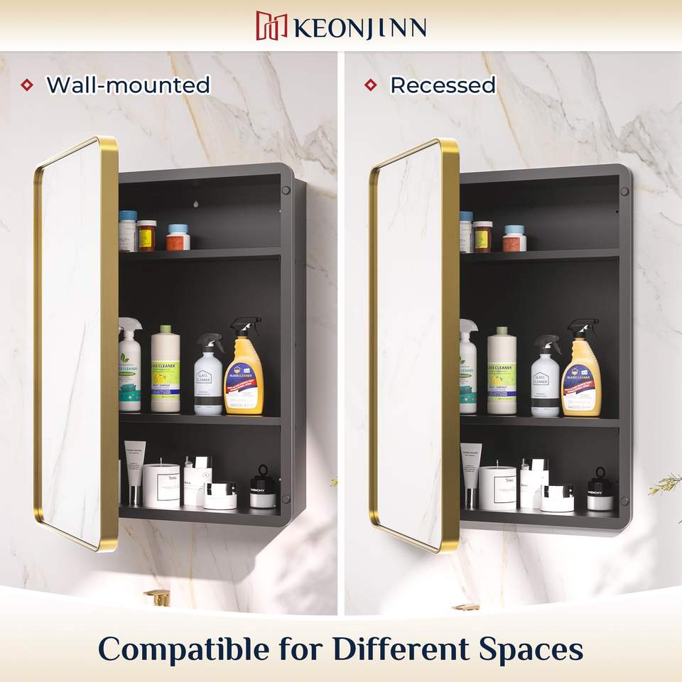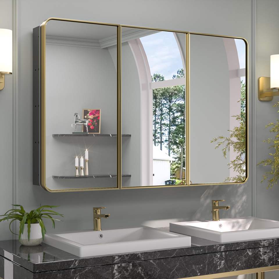 Elegante marco de metal en tonos dorados, gabinete de baño Rectangular de una sola Puerta, espejo de baño montado en la pared iluminado, esquinas redondeadas