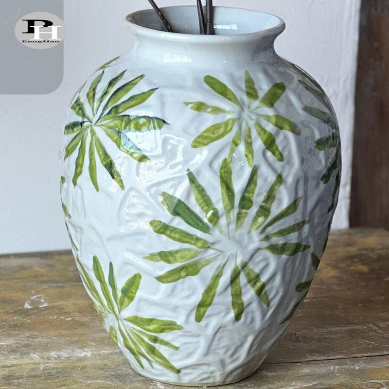 Elegante florero de porcelana pintado a mano, barato al por mayor, jarrón de cerámica de color blanco y verde, jarrón de bambú de la suerte de cerámica