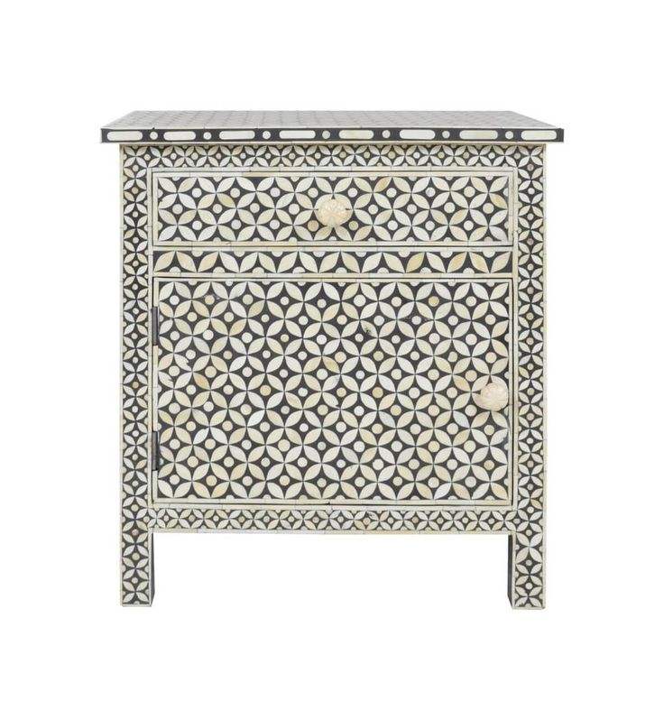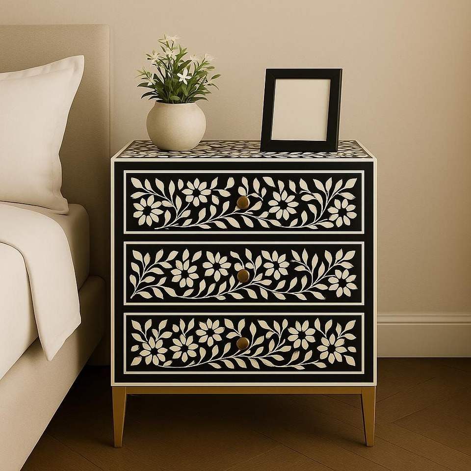 Elegante Gabinete de Almacenamiento con Cajones Laterales y Incrustaciones de Hueso Hecho a Mano, Mueble de Noche de Madera con Diseño Artesanal