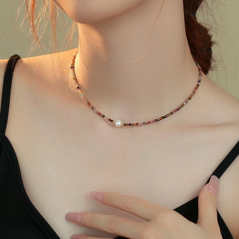 Elegante Collar de Perlas Naturales de Alta Gama con Cadena de Clavícula de Cuentas de Turmalina Coloridas, Diseño Exquisito, Efecto Dopamina