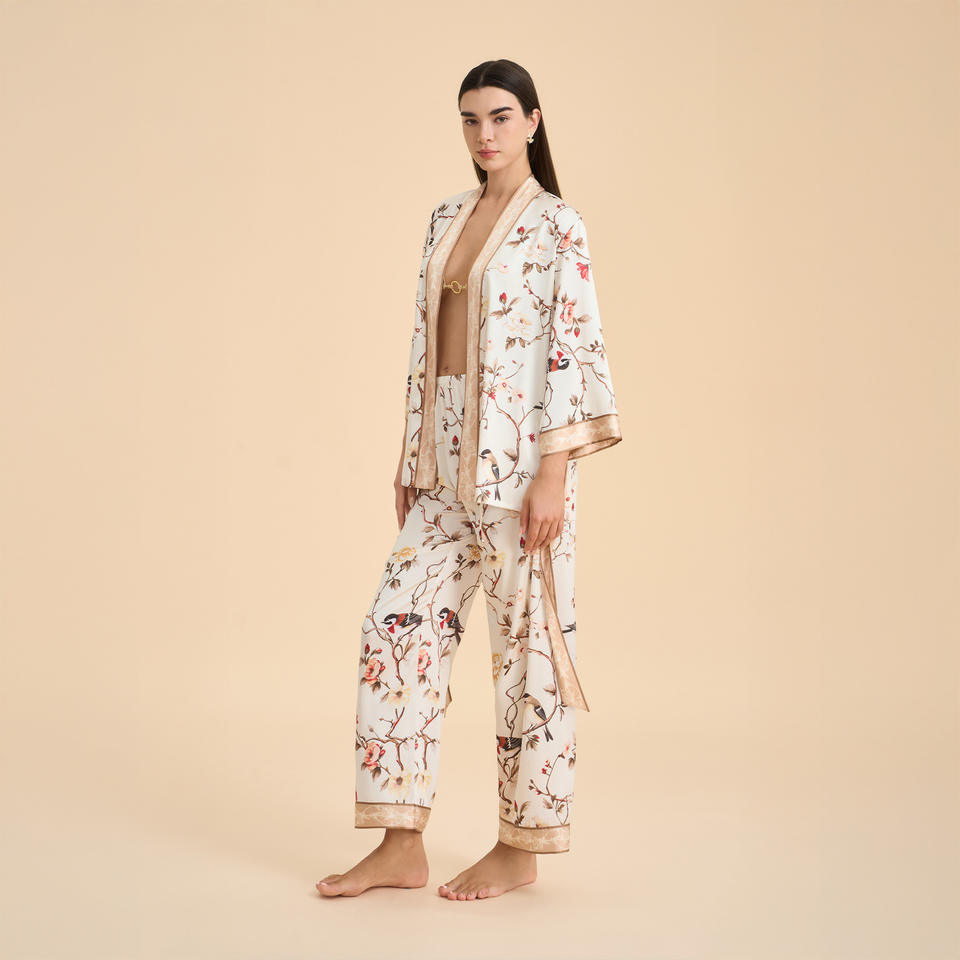 Elegante Conjunto de Pijama Térmico de Manga Larga con Frente Abierto para Mujer, Ropa de Dormir de Satén y Chifón con Cintura Elástica para Primavera