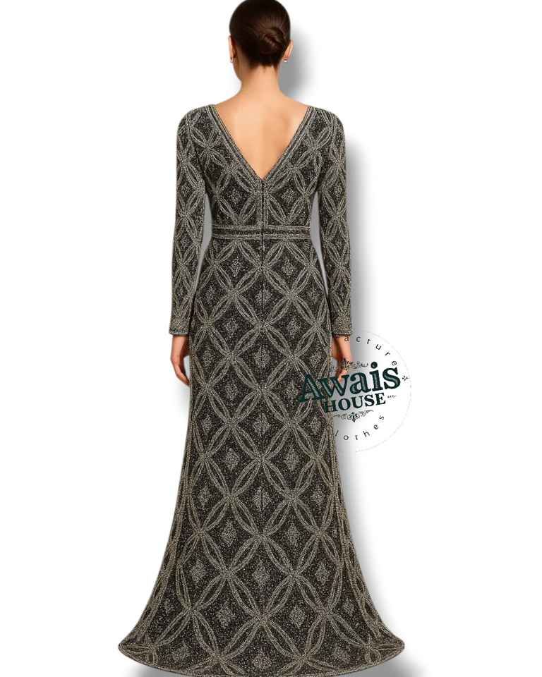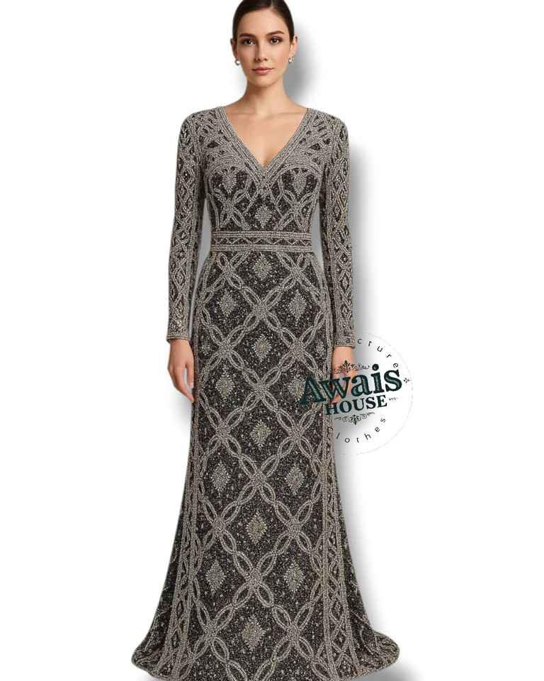 Elegante Vestido de Novia de Lujo con Corte en A, Manga Larga, Bordado con Cuentas, Flores, Cintura Imperio, Largo hasta el Suelo, Cristales, Perlas y Diamantes
