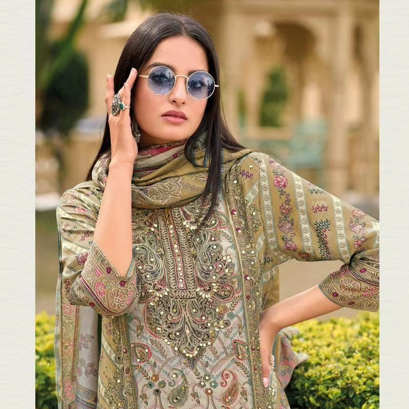 "Elegante Impresión Digital Maslin Shalwar Kameez con Aari Handwork, Rayon Bottom e Impresionante Dupatta Digital"