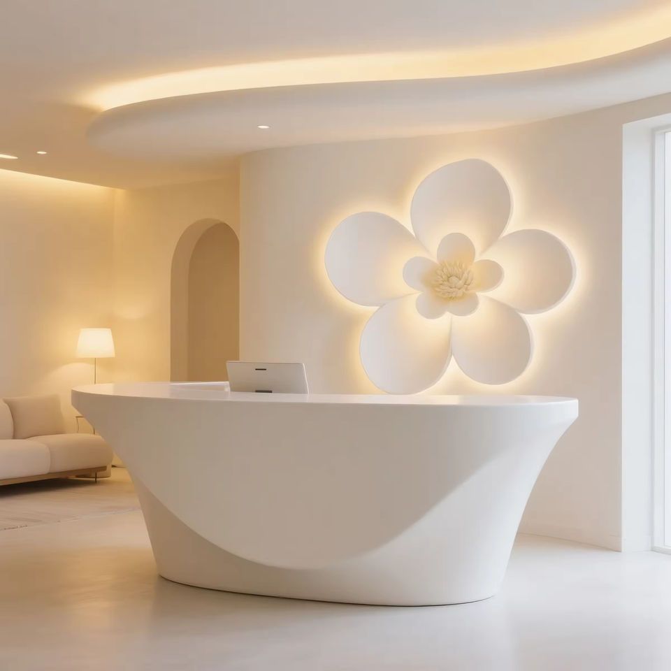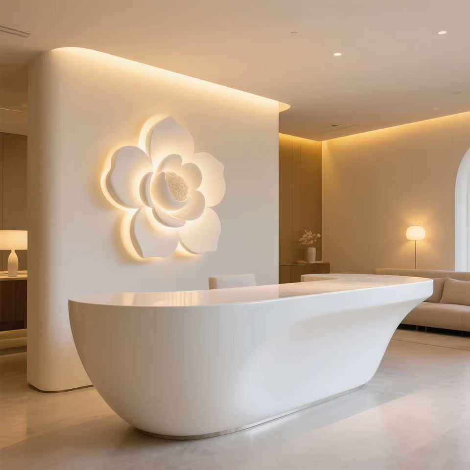 Elegante Mostrador de Recepción Curvo Extensible Moderno de Color Blanco con Decoración Floral de Pared para Hoteles de Lujo, Edificios de Oficinas y Vestíbulos de Centros Comerciales