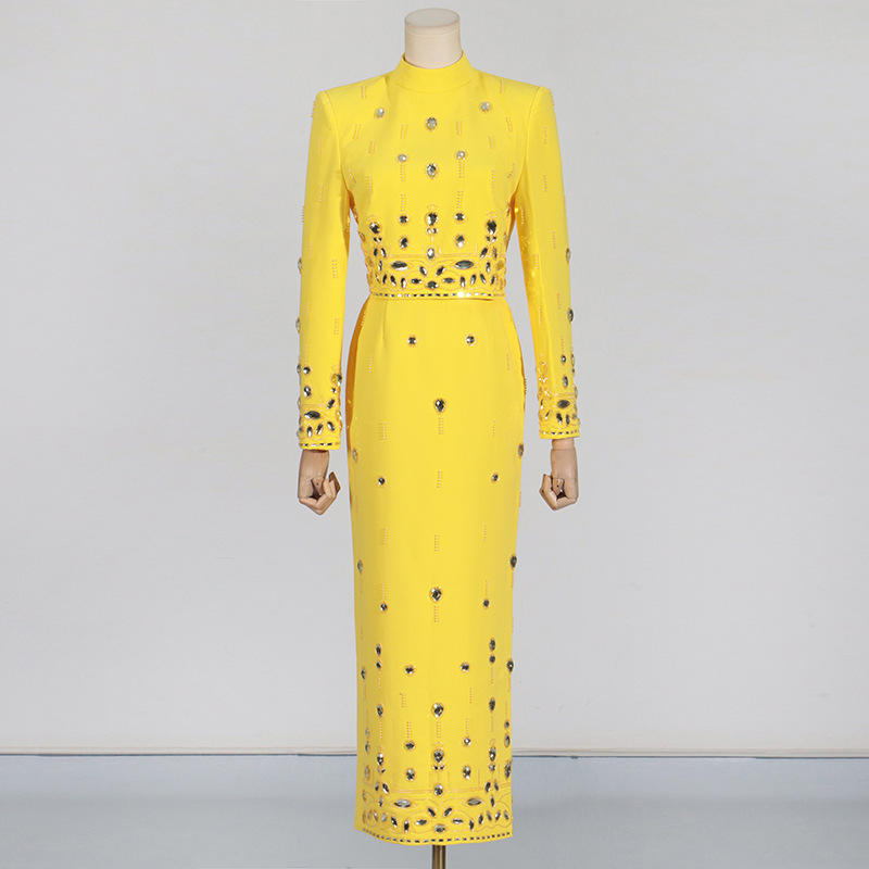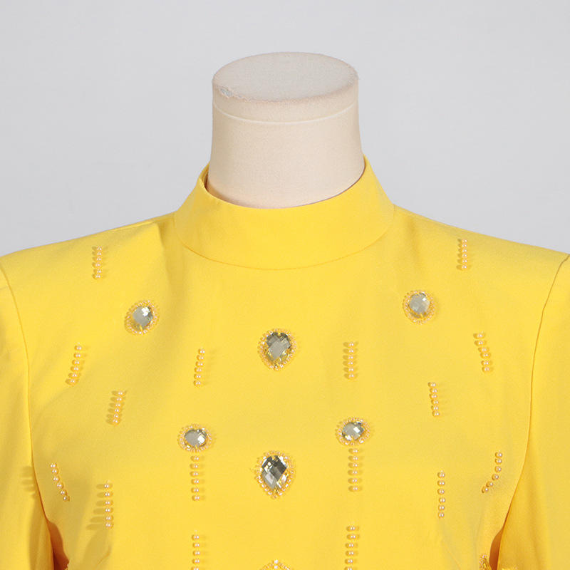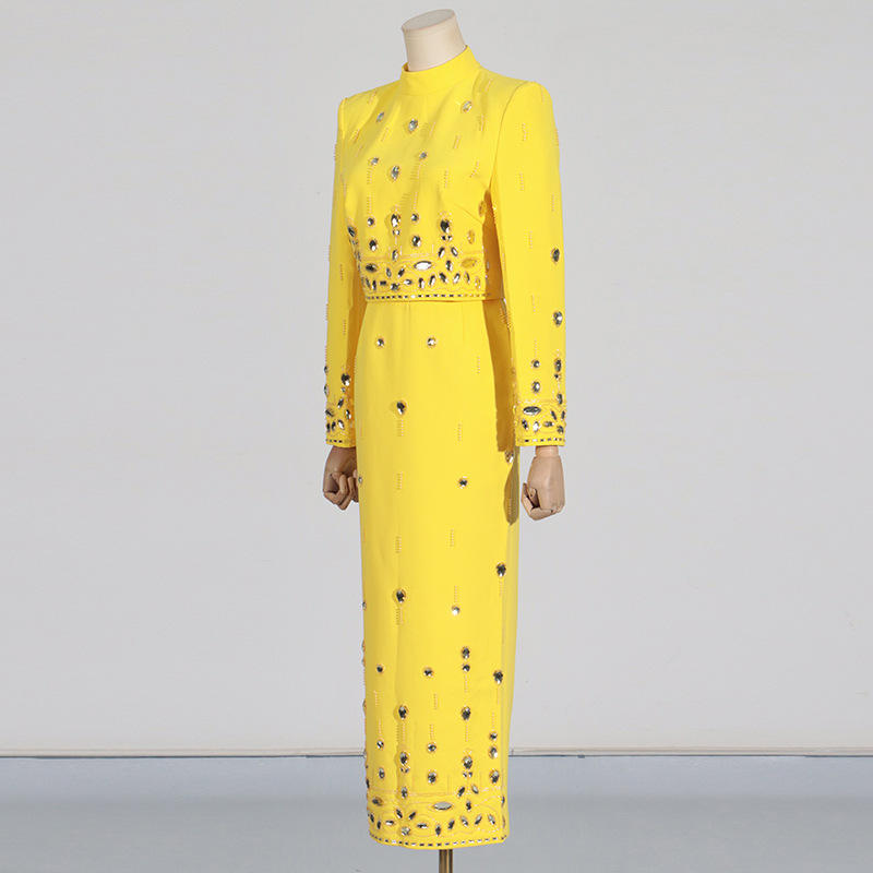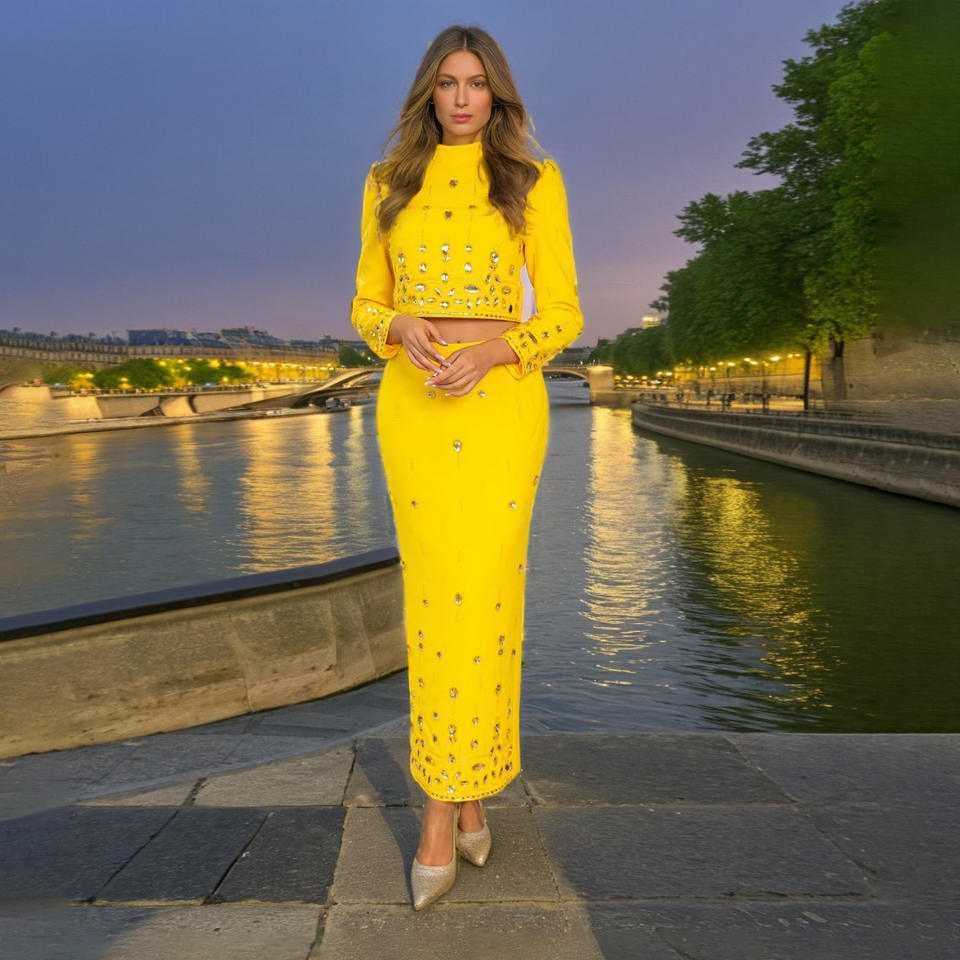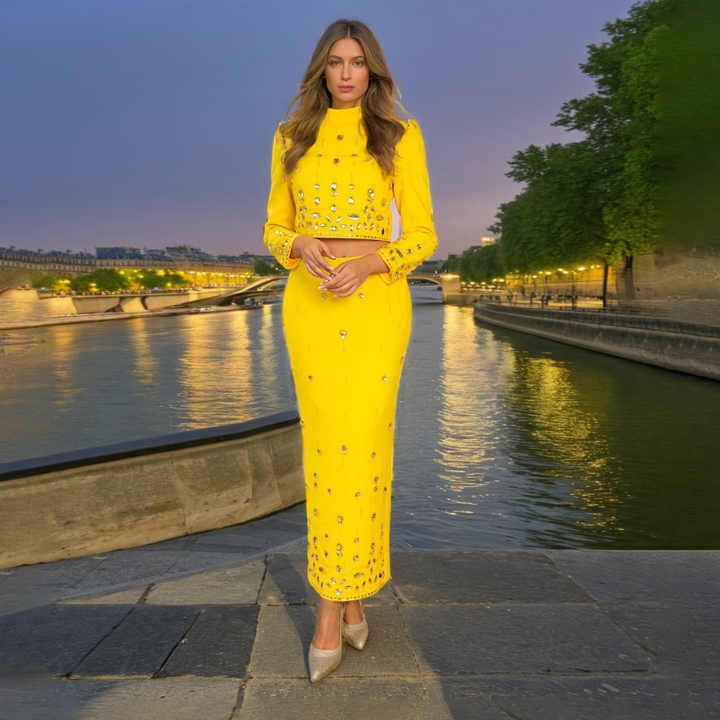 Elegante Conjunto de Dos Piezas con Diamantes para Mujer, Cuello Alto, Manga Larga, Falda de Cintura Alta en Línea A
