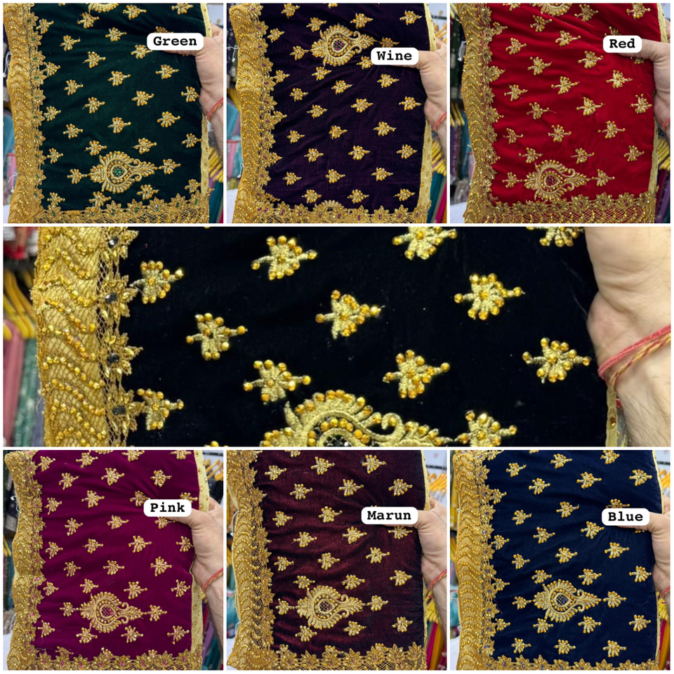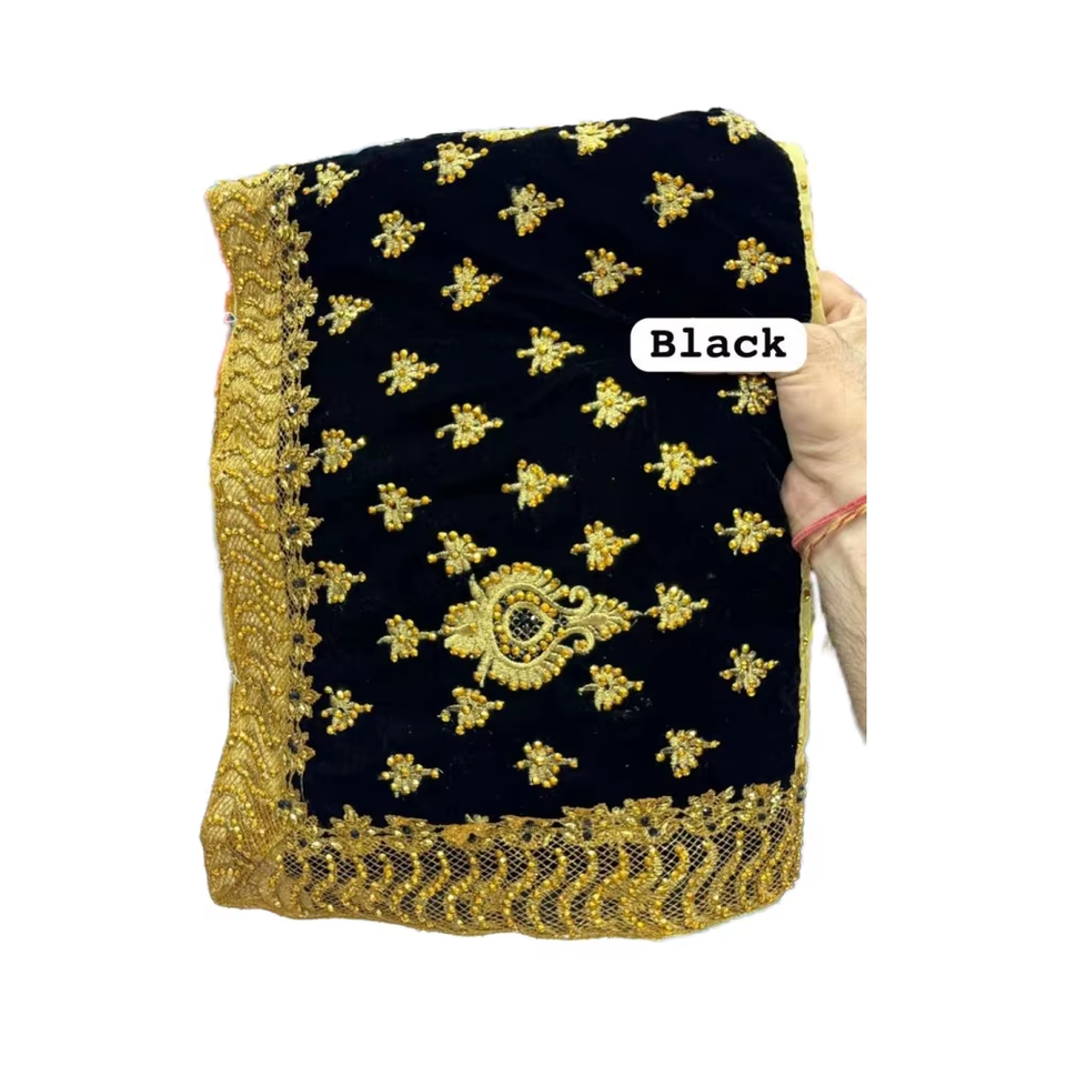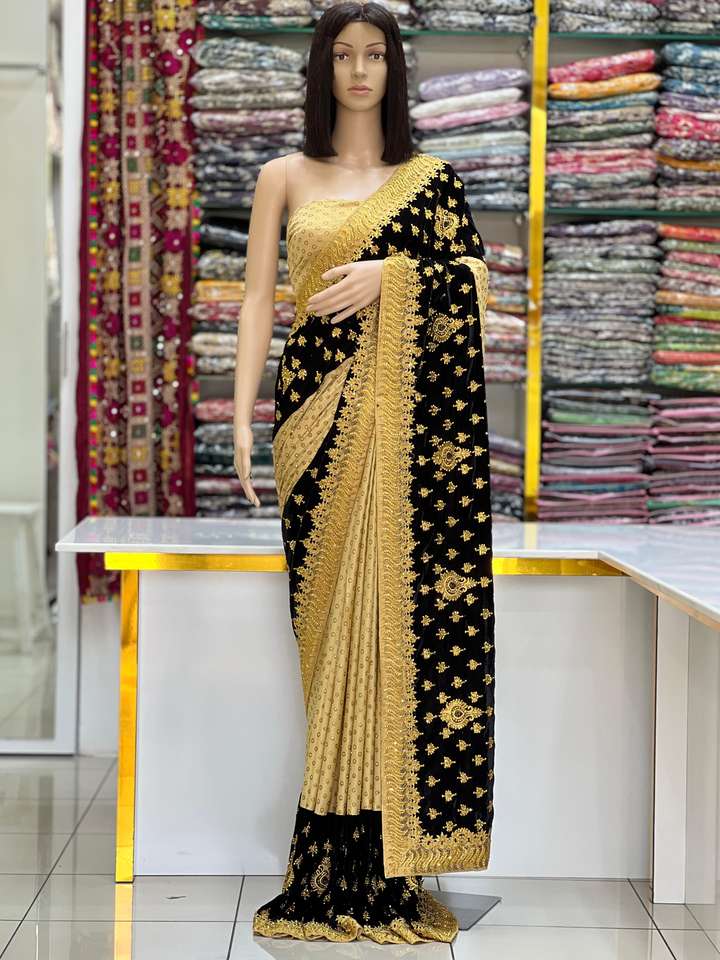 Elegante conjunto de saree de terciopelo puro con blusa de seda Malai, con bordados elaborados, trabajo artesanal fino y un elegante borde decorativo.