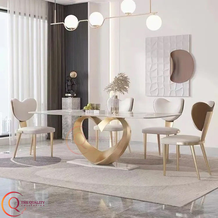 Elegante mesa de comedor rectangular con base dorada en forma de corazón Una adición elegante y romántica a su espacio de comedor.