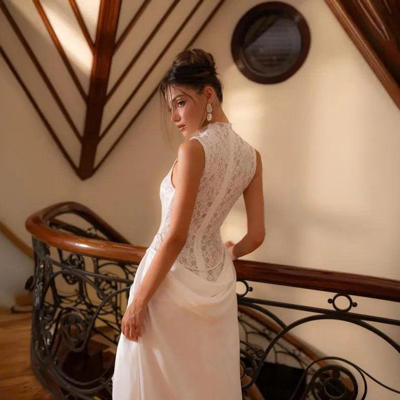 Estilo:Paneles de encaje transparente, escote alto, y dramático vestido de seda largo flujo