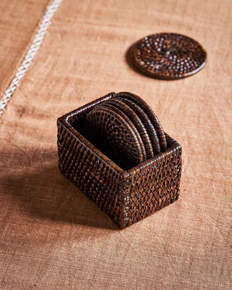 Elegante posavasos de ratán texturizado, perfecto para combinar con vajilla de cerámica, vidrio o madera, ideal para la presentación en el comedor.