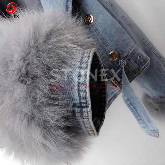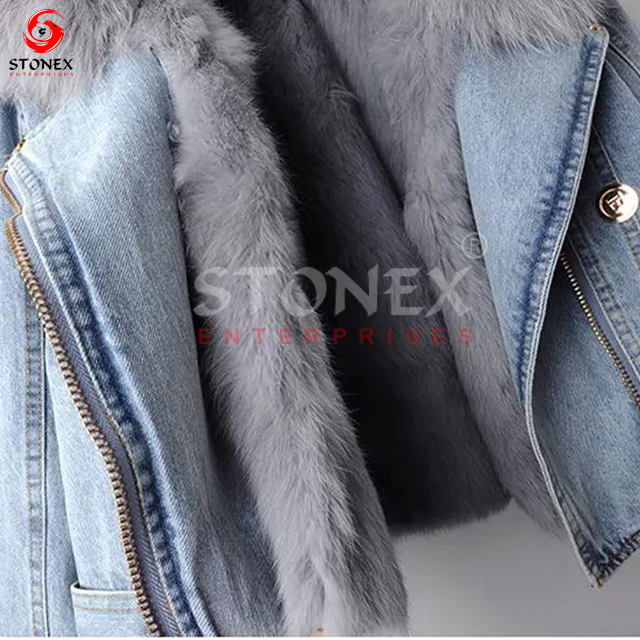 Chaqueta de Mezclilla de Algodón Transpirable con Cuello de Piel de Zorro Auténtica para Mujer, Estilo Elegante, Holgada, Larga, con Cinturón y Cremallera