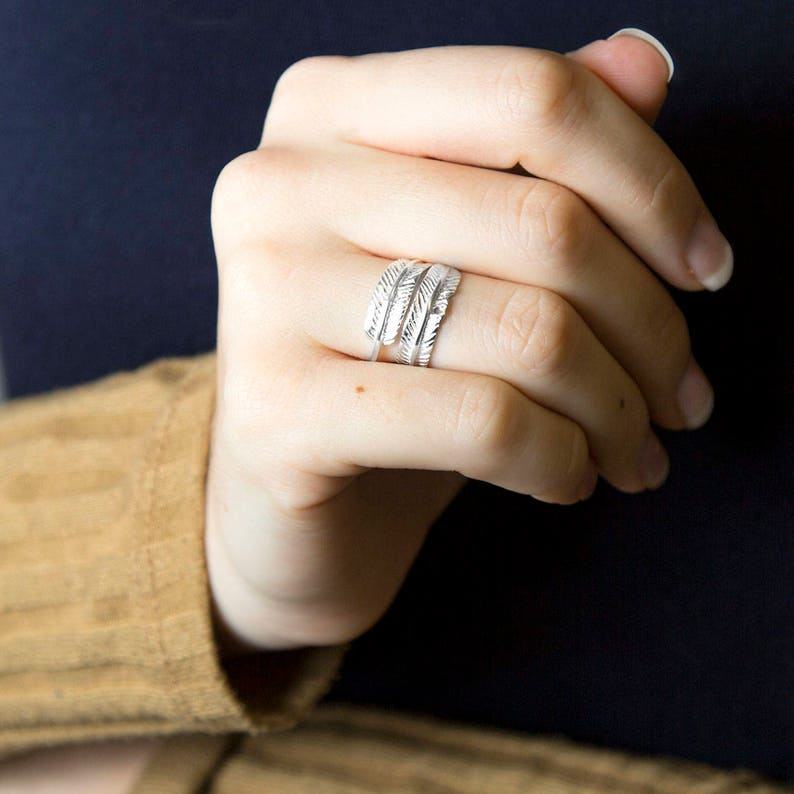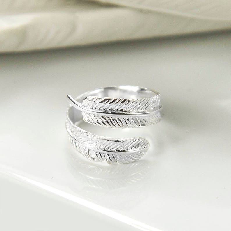 Anillo de pluma ajustable pulida elegante y único, joyería de boda de plata esterlina para mujer