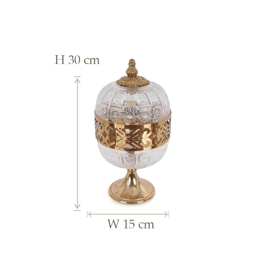 Elegante quemador de incienso de latón dorado con cuerpo de cristal alto y patrones decorativos intrincados para interiores de lujo