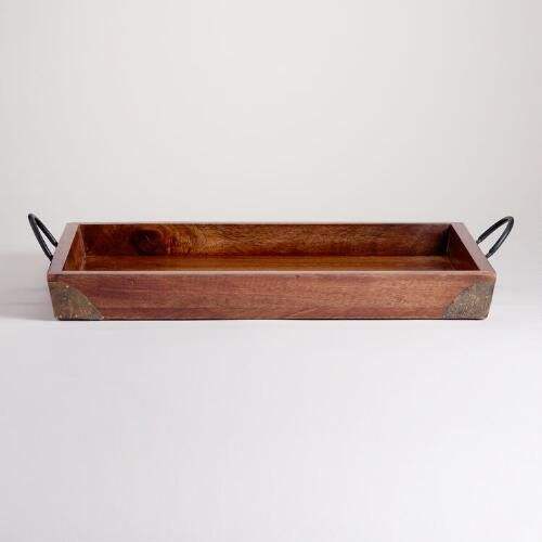 Elegante bandeja rectangular de madera de mango con acabado duradero y asas resistentes, perfecta para servir comida y bebidas a los invitados con estilo.