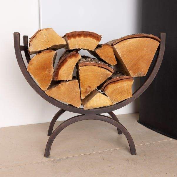 Elegante estante de troncos de hierro rústico con detalles de desplazamiento para salas de estar de estilo rural con chimeneas de piedra o ladrillo