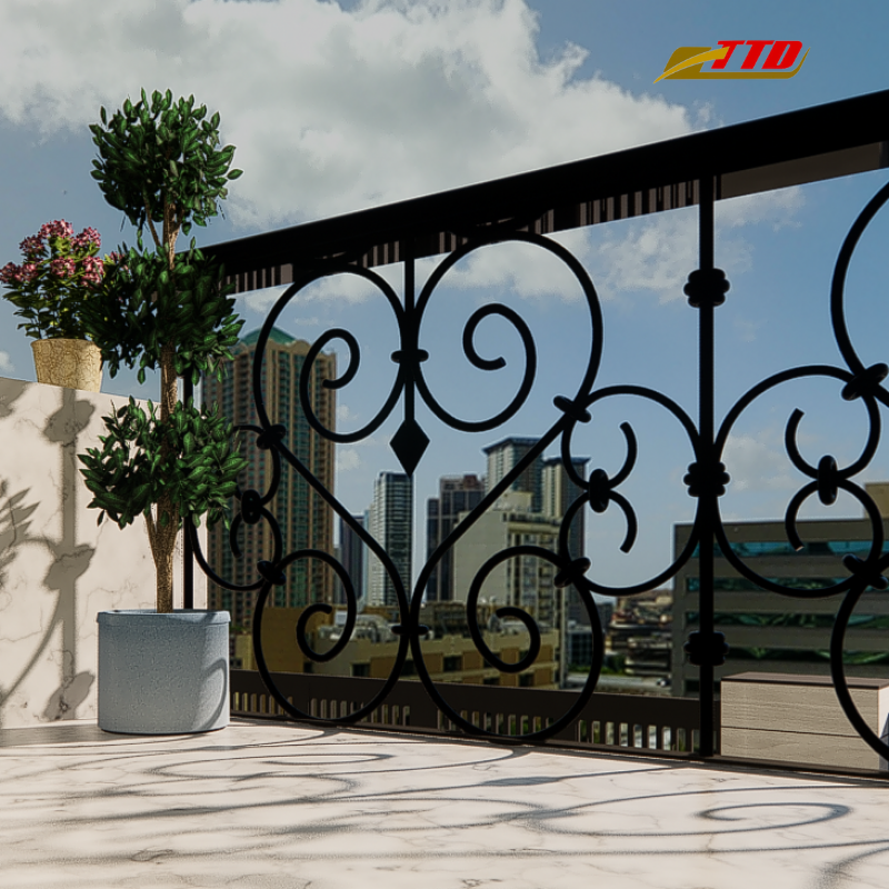Elegante barandilla de balcón de hierro forjado con diseño decorativo moderno forjado a mano y acabado en polvo duradero para exteriores