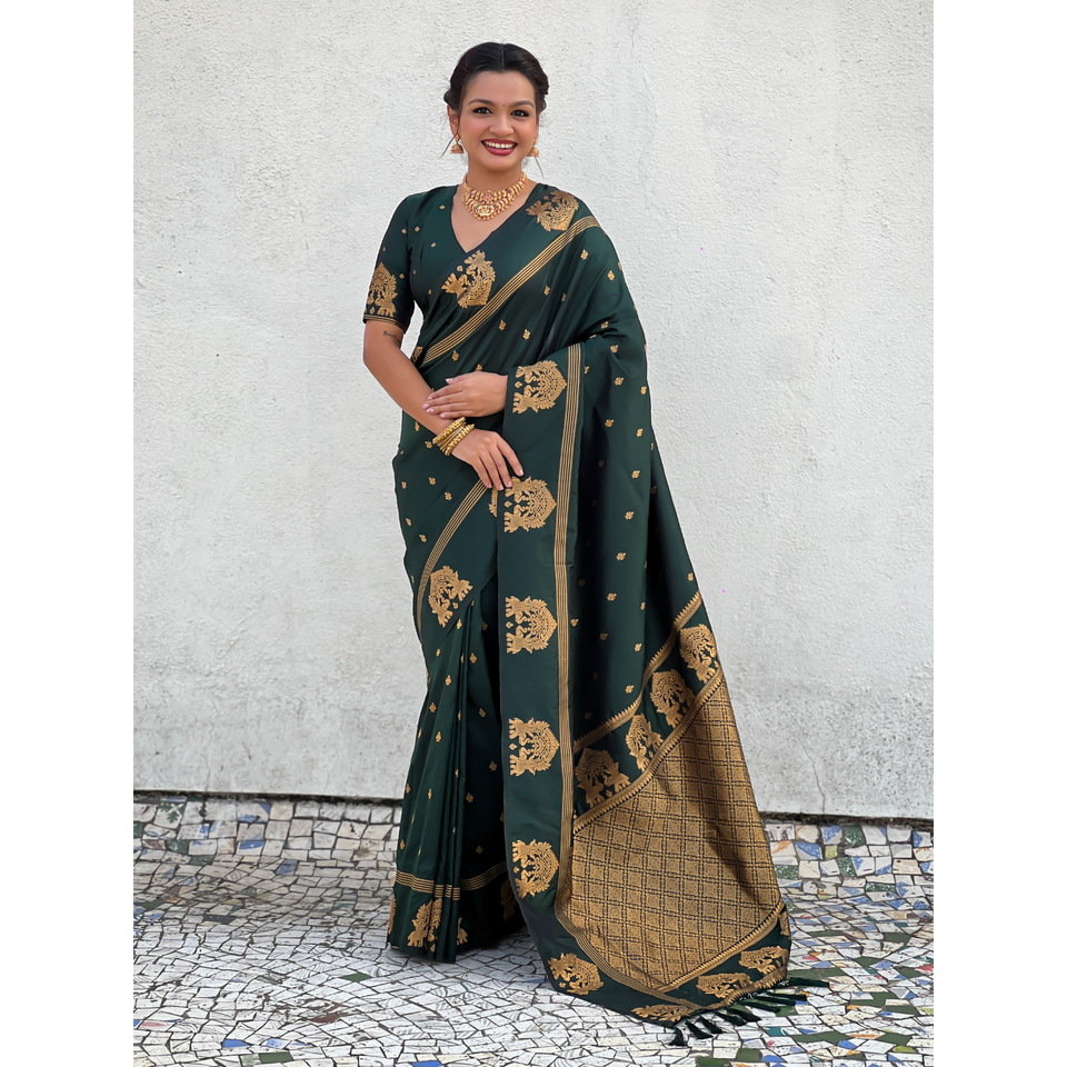 Chal y Bufanda Étnicos de Seda Suave Tejida con Zari Tradicional, Color Verde Botella, de Elite Weaves, 600g
