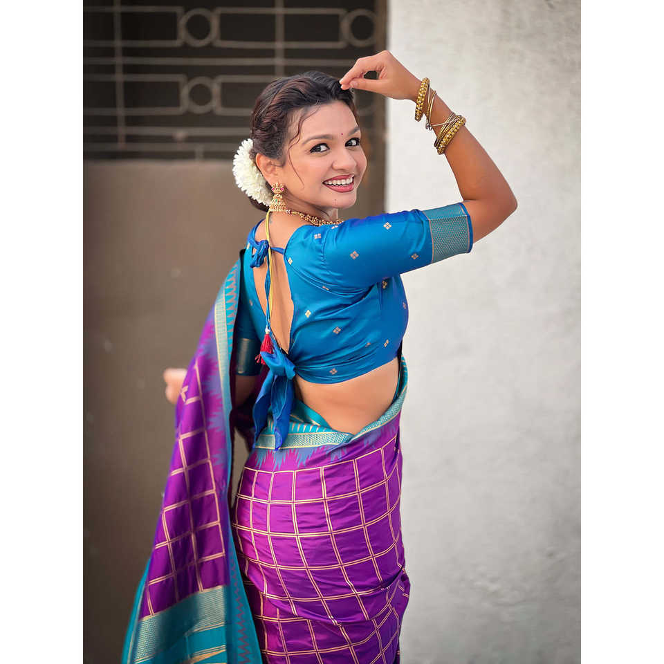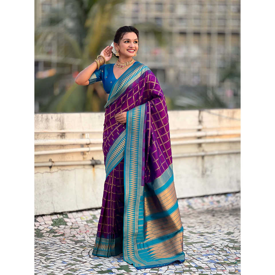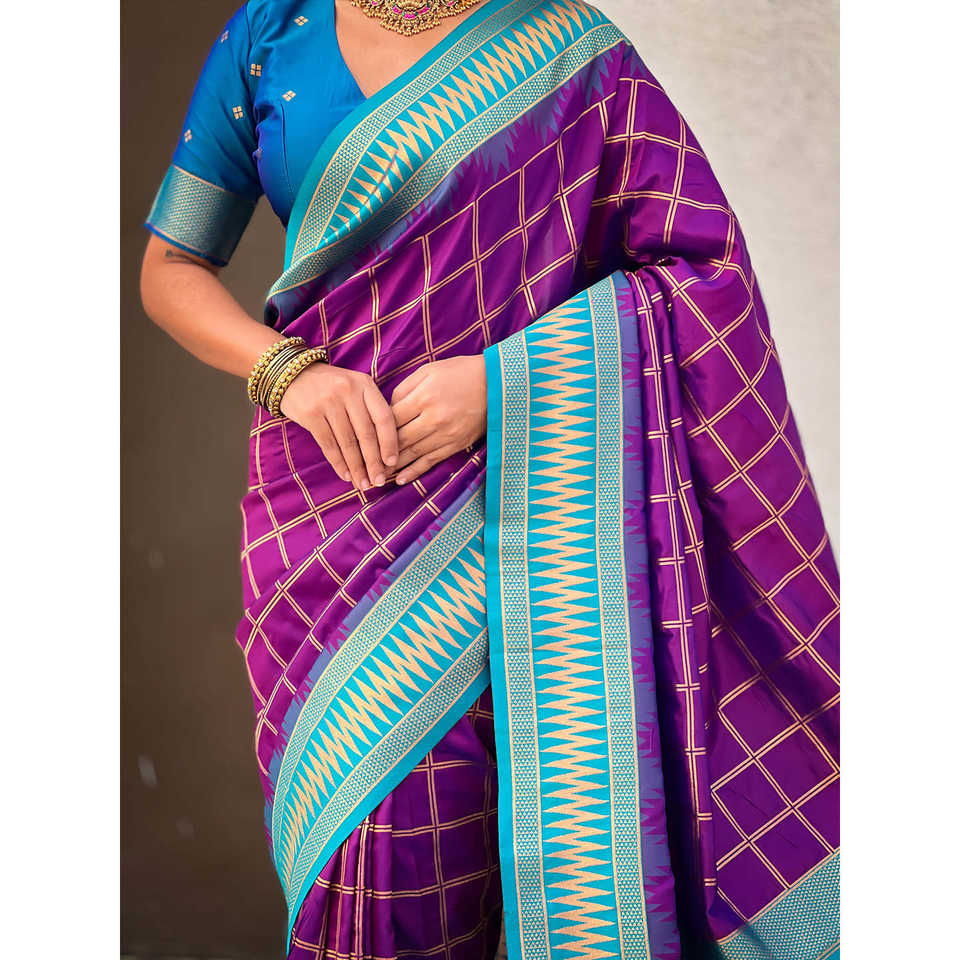 Sari de Seda Suave Morado con Estampado de Cuadros de Elite Weaves, con Elegante Vestido de Club Tejido con Contraste de Zari Tradicional