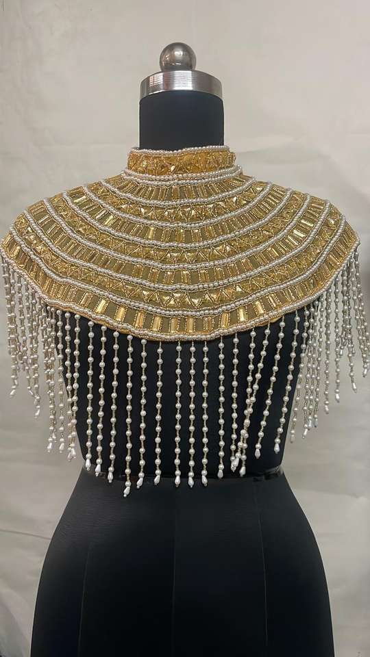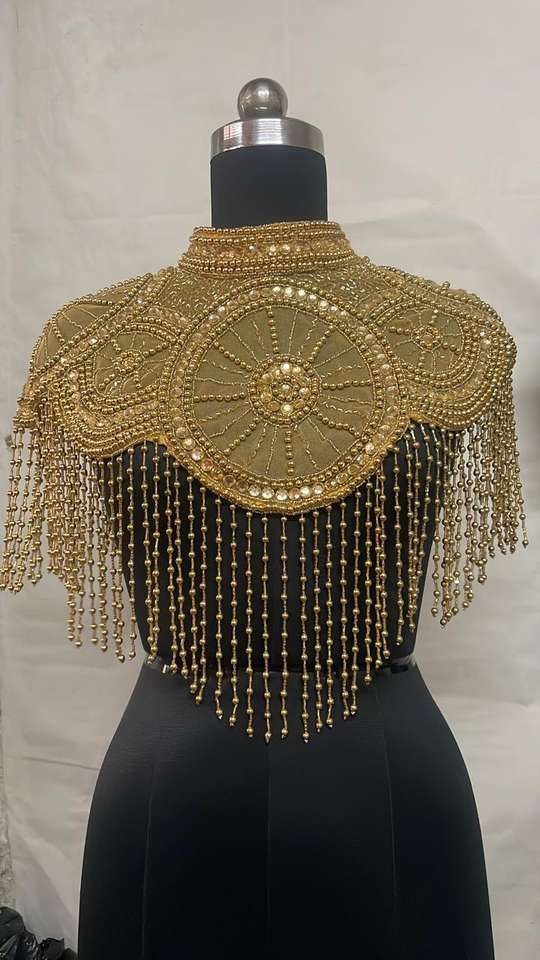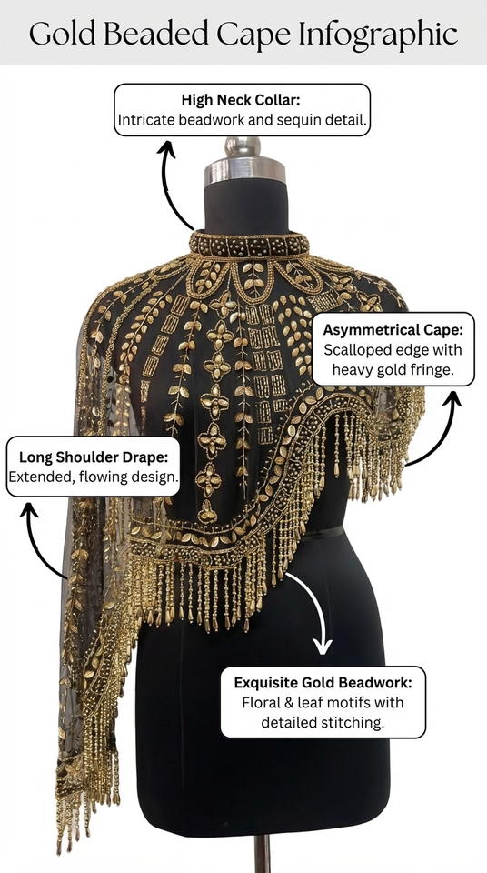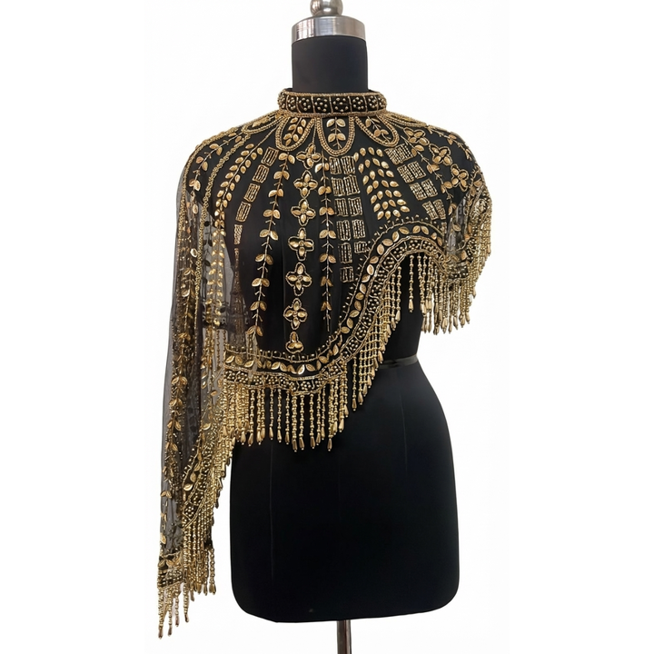 Capa de Hombro de Nailon con Flecos Bordados y Cuentas Doradas Ellora, Vestido de Noche, Disfraz para Actuación Escénica, Prenda de Moda, Decoración