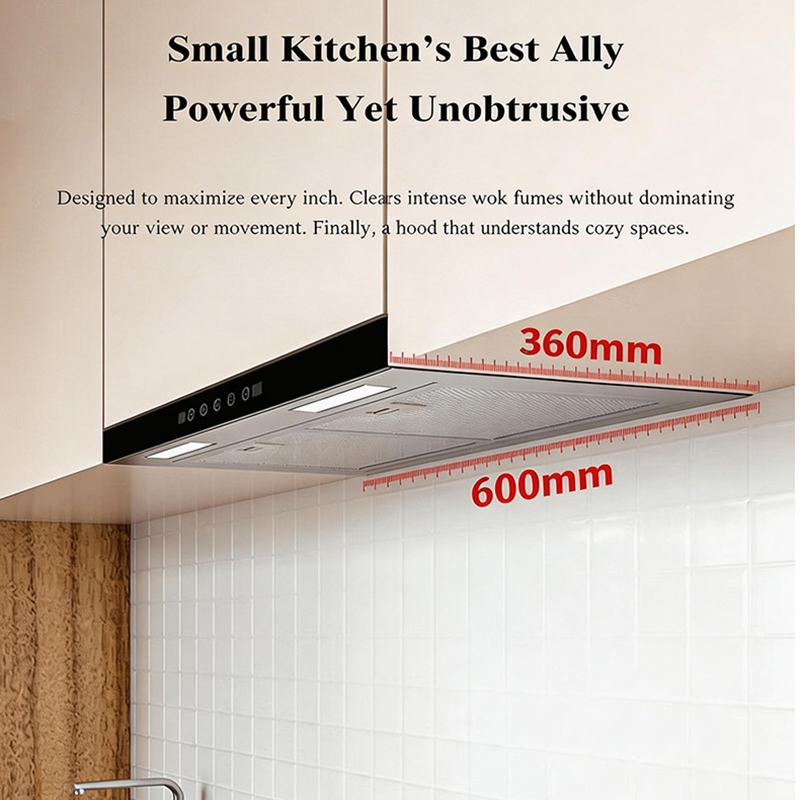 Campana extractora empotrada compacta que ahorra espacio, con fuerte succión y control inteligente por pantalla táctil.