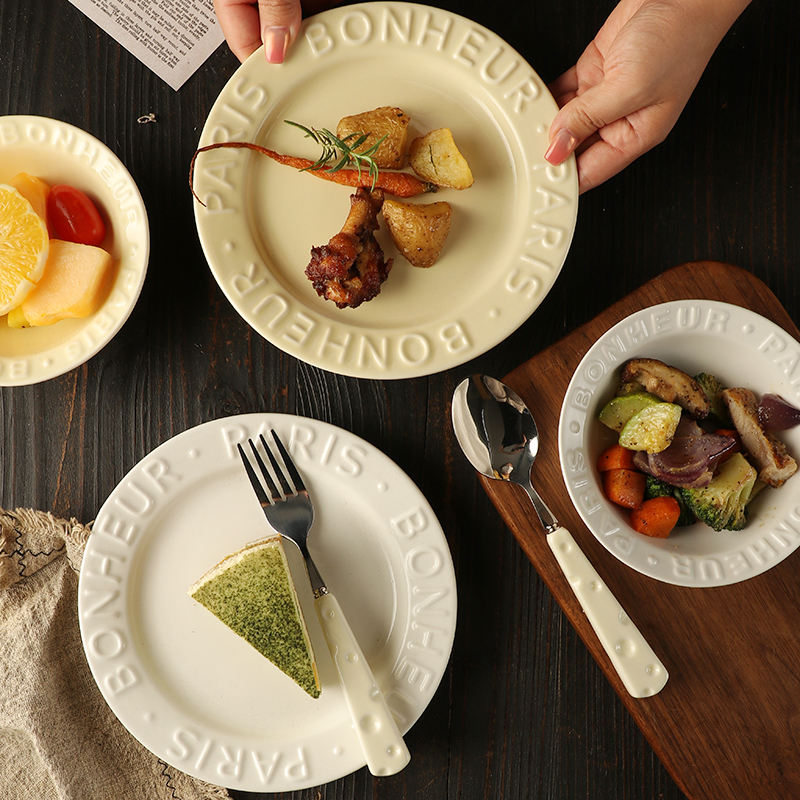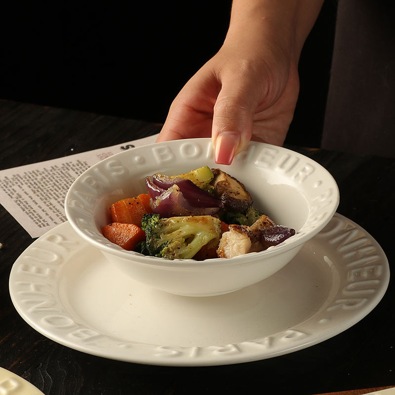 Plato de cena de cerámica con letras francesas en relieve, platos fríos, ensalada, Pasta, postre, bistec, bandeja para servir, tazón de sopa, vajilla para restaurante