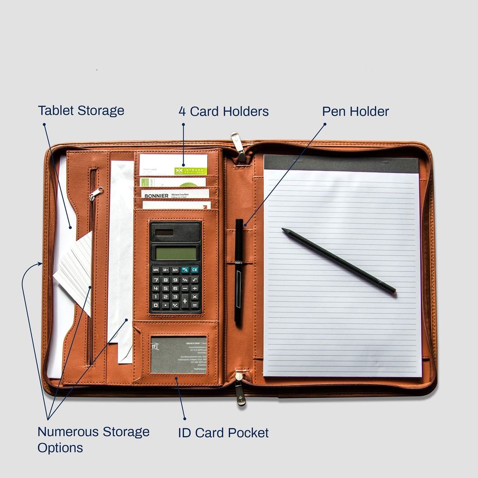 Logotipo en relieve en la parte delantera Padfolio personalizado para mujer Cartera de cuero A4 con cierre de cremallera