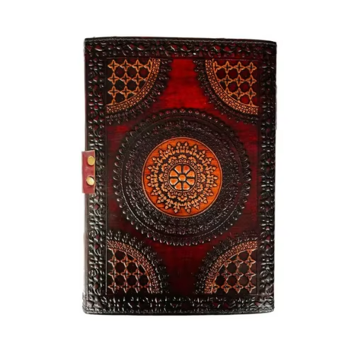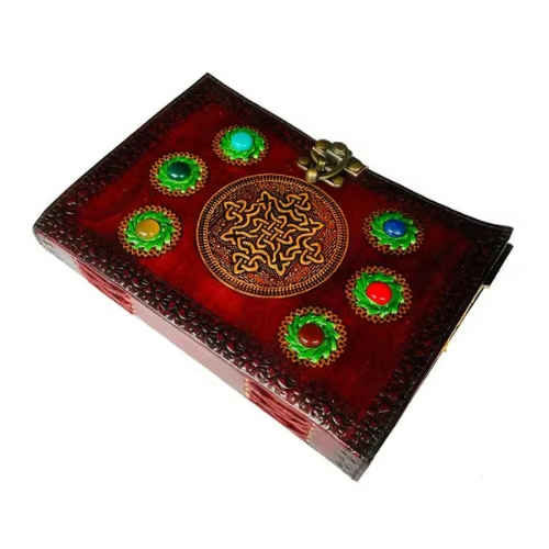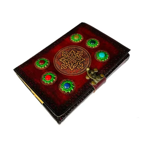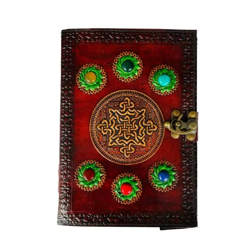 Diario de Cuero con Siete Piedras Preciosas en Relieve, Cuaderno Hecho a Mano con Tapa Dura Vintage, Cubierta Amarillo Marrón, Papel con Borde Decorativo, Tacto Real